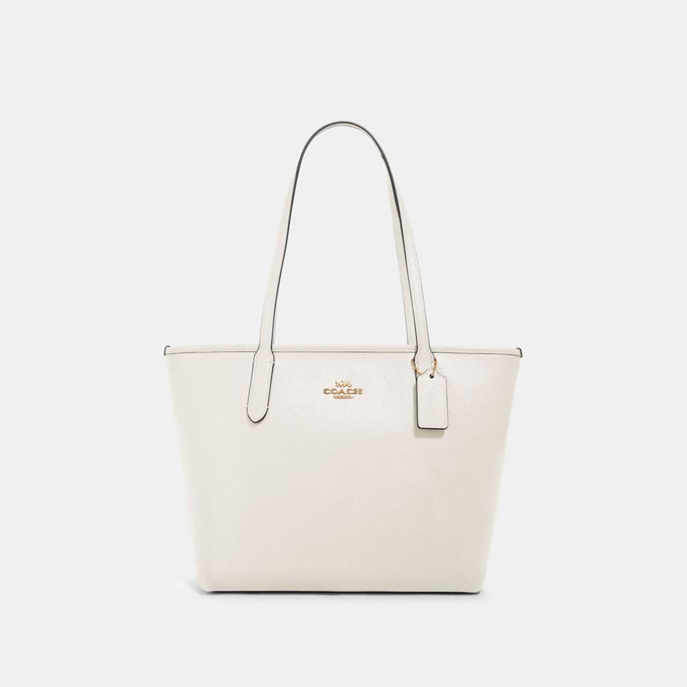 Crossgrain leather| Cell phone and multifunction pockets| Zip-top closure, fabric lining| Handles with 8 3/4" drop| 10 1/2" (L) x 10 1/4" (H) x 4 1/4" (W)