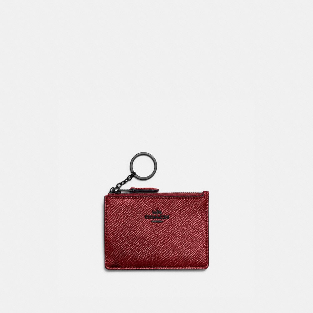 Metallic crossgrain leather| Credit card slot and ID window| Zip-top closure, fabric lining| Attached split key ring| 4 1/4" (L) x 3" (H)