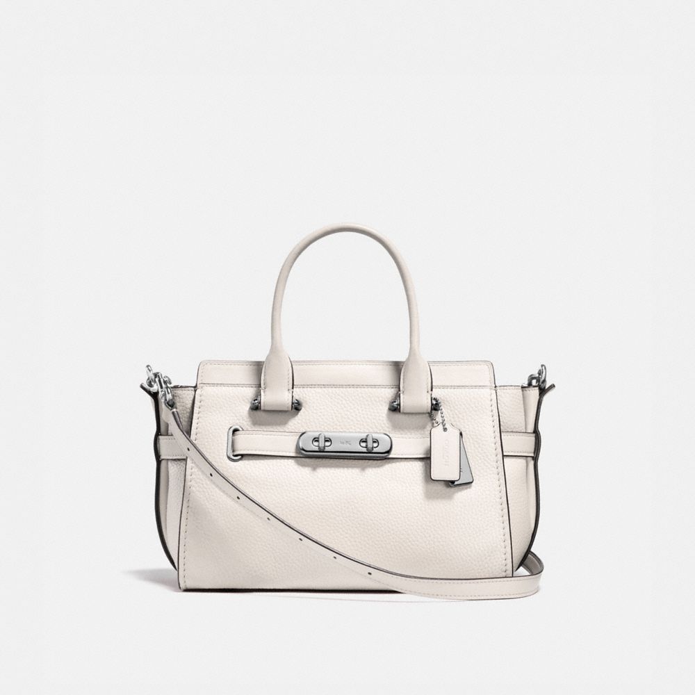 Pebble leather| Inside zip and snap pockets| Zip-top closure, fabric lining| Handles with 4" drop| Outside slip pocket| Detachable strap with 19" drop for shoulder wear| Compatible with Coach interchangeable straps| 10 3/4" (L) x 7 3/4" (H) x 5 3/4" (W)