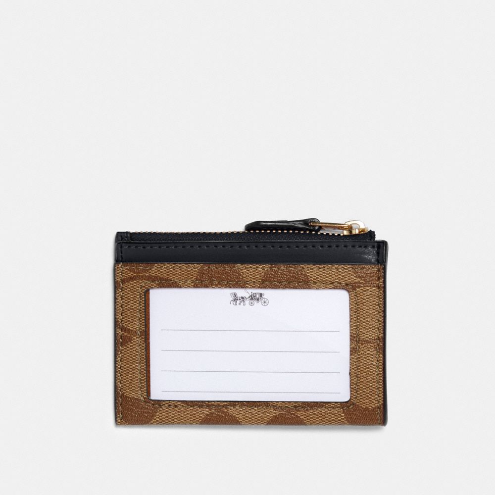 Signature coated canvas and smooth leather| Two credit card slots| ID window| Zip-top closure, fabric lining| Attached split key ring| 4 1/4" (L) x 3" (H) x 1/2" (W)