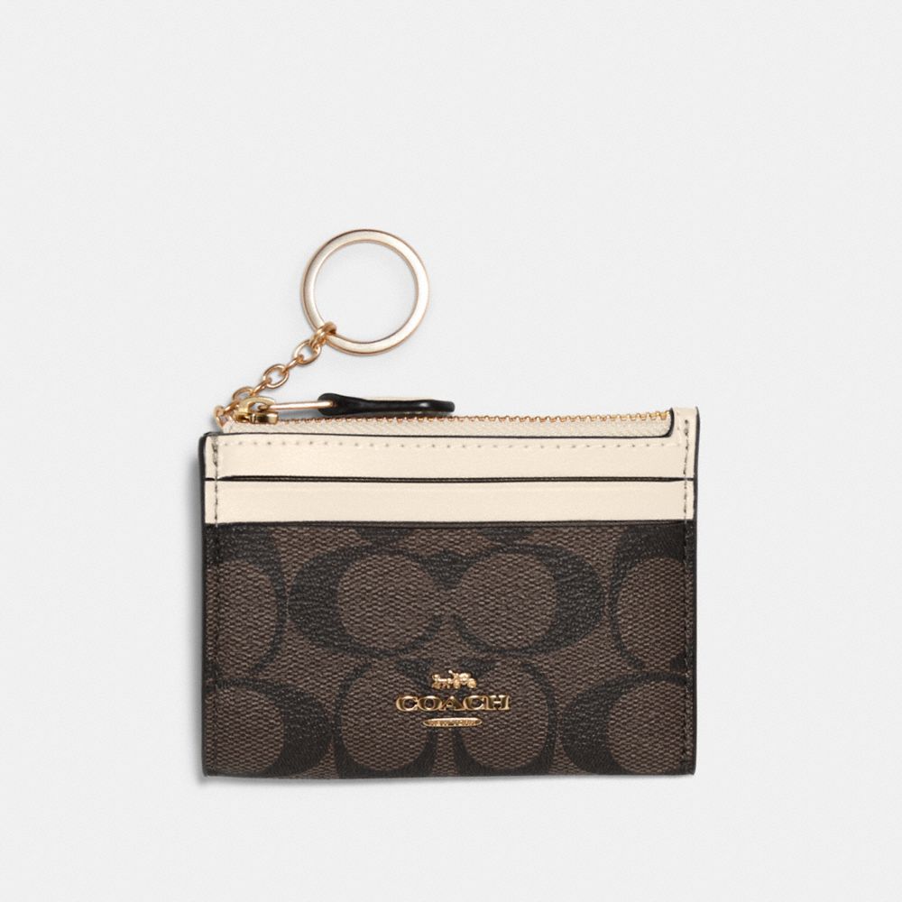 Signature coated canvas and smooth leather| Two credit card slots| ID window| Zip-top closure, fabric lining| Attached split key ring| 4 1/4" (L) x 3" (H) x 1/2" (W)