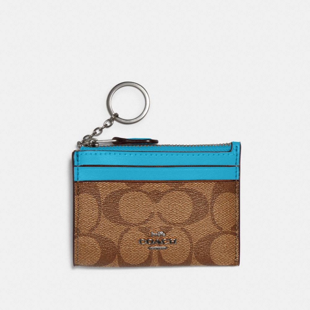 Signature coated canvas and smooth leather| Two credit card slots| ID window| Zip-top closure, fabric lining| Attached split key ring| 4 1/4" (L) x 3" (H) x 1/2" (W)