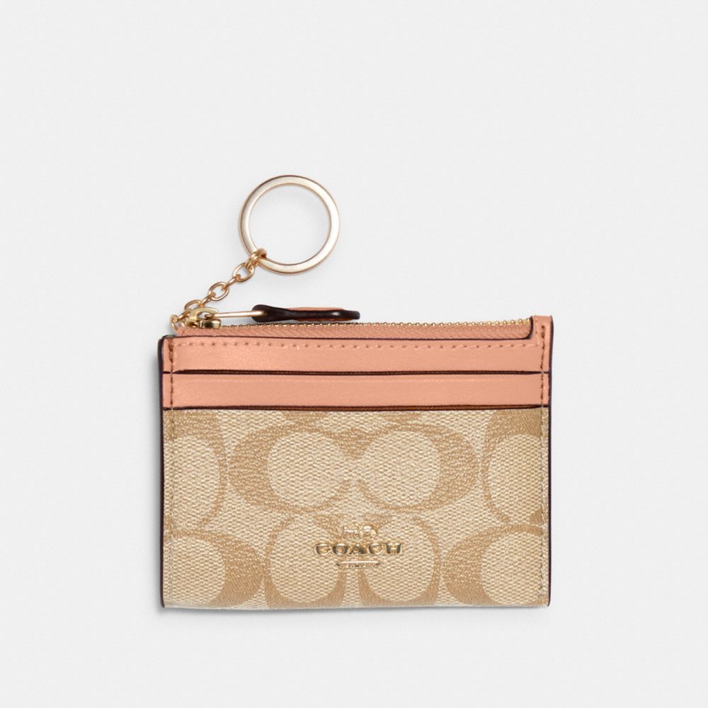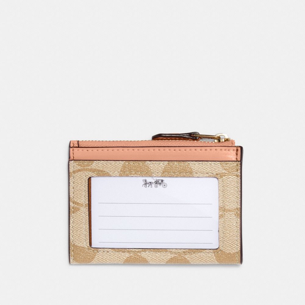 Signature coated canvas and smooth leather| Two credit card slots| ID window| Zip-top closure, fabric lining| Attached split key ring| 4 1/4" (L) x 3" (H) x 1/2" (W)Style No. 88208