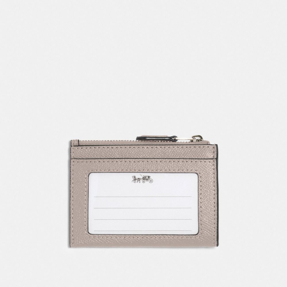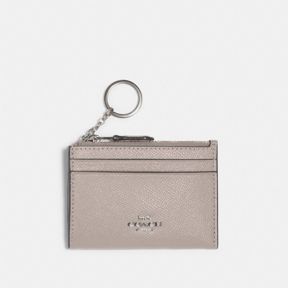 Crossgrain leather| Two credit card slots| ID window| Zip-top closure, fabric lining| Attached split key ring| 4 1/4" (L) x 3" (H) x 1/2" (W)
