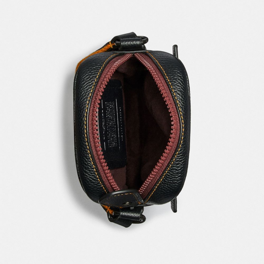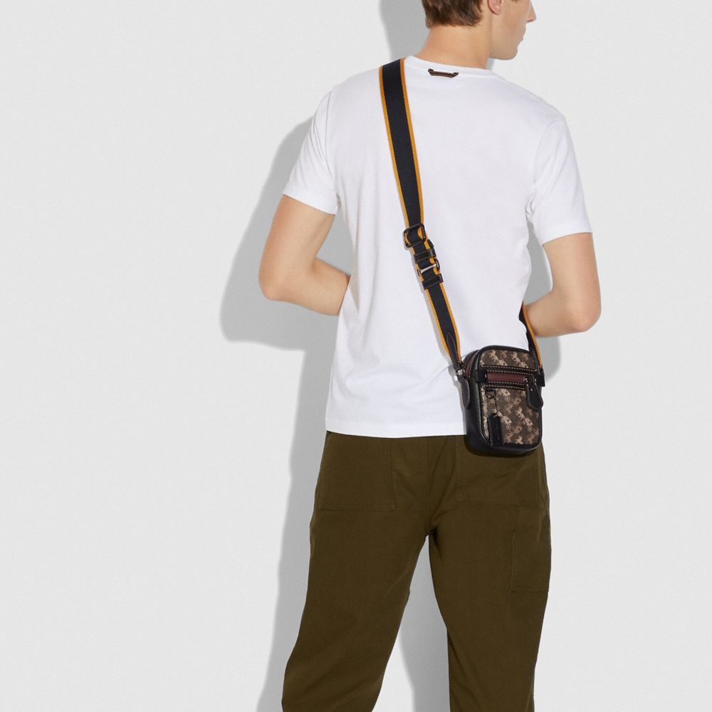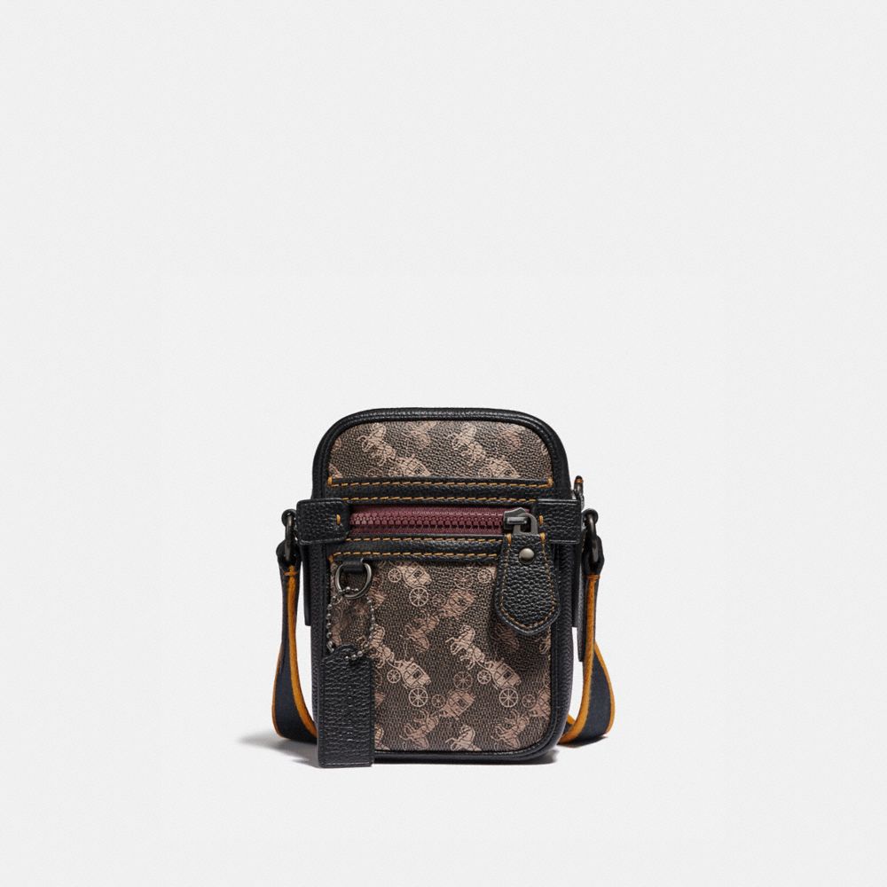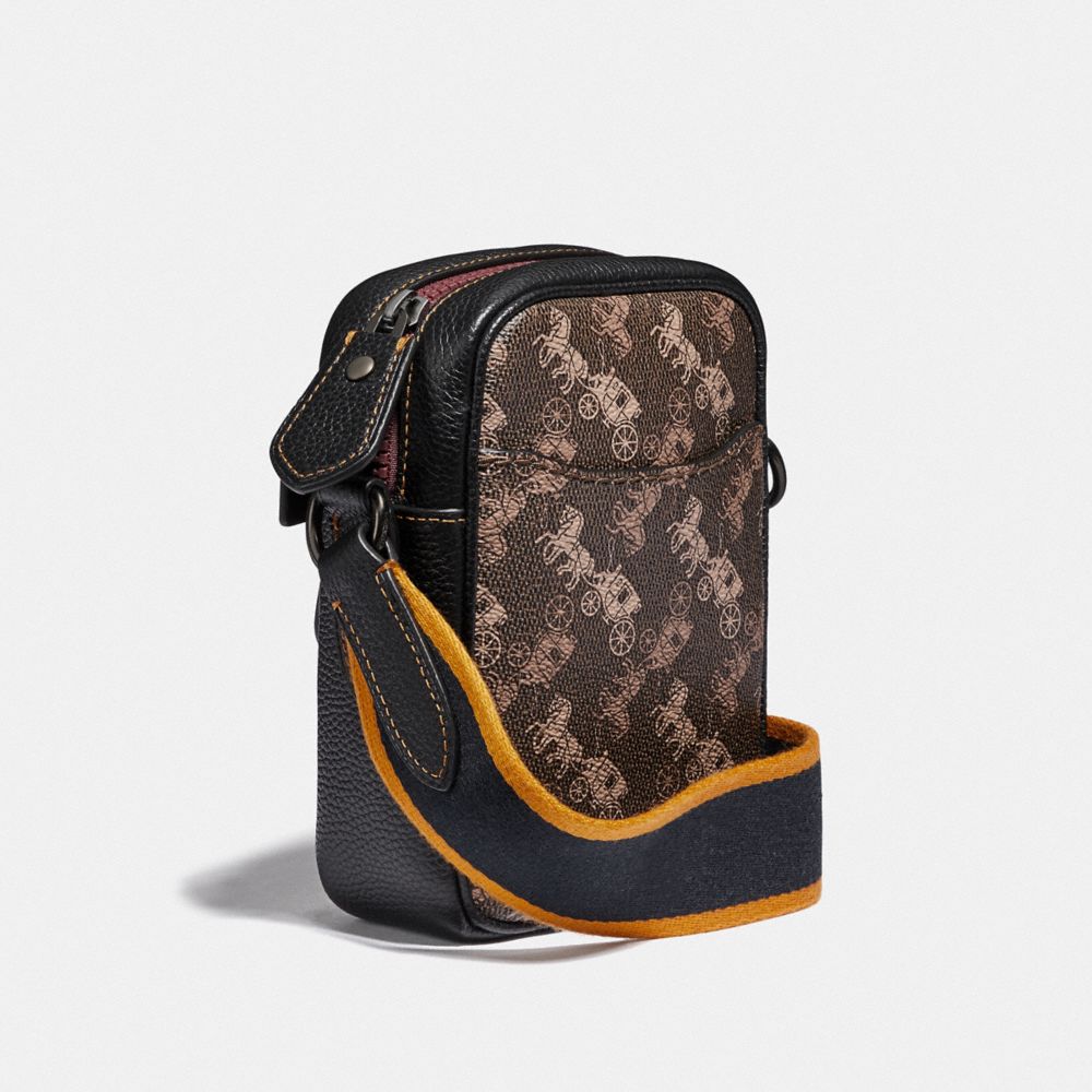 Printed coated canvas and polished pebble leather| Inside multifunction pocket| Zip closure, fabric lining| Outside zip and slip pockets| Adjustable strap with 25" drop for shoulder or crossbody wear| 4 1/2" (L) x 6 1/2" (H) x 2 1/4" (W)