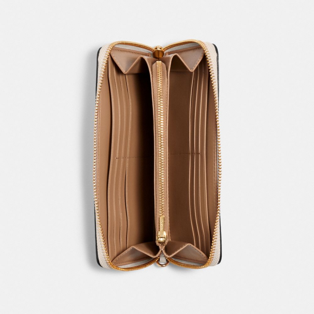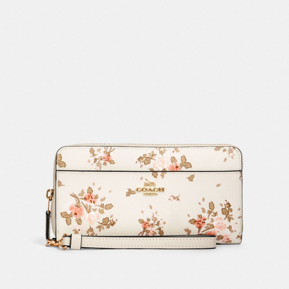 Printed coated canvas with smooth leather details| 12 credit card slots| Full-length bill compartments| Zip coin pocket| Zip-around closure| Outside open pocket| Detachable wrist strap| 7 1/2" (L) x 4" (H) x 3/4" (W)| Fits all phone sizes up to an iPhone X and Samsung S7 Edge