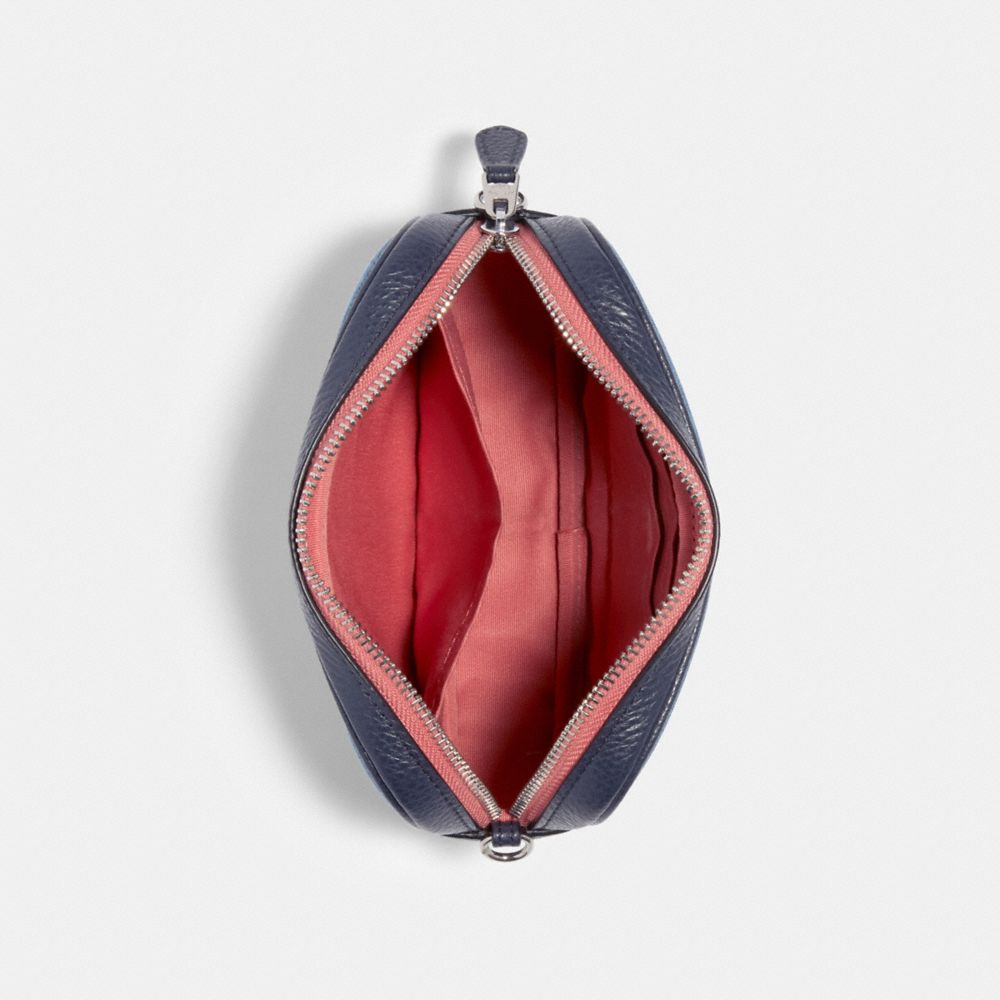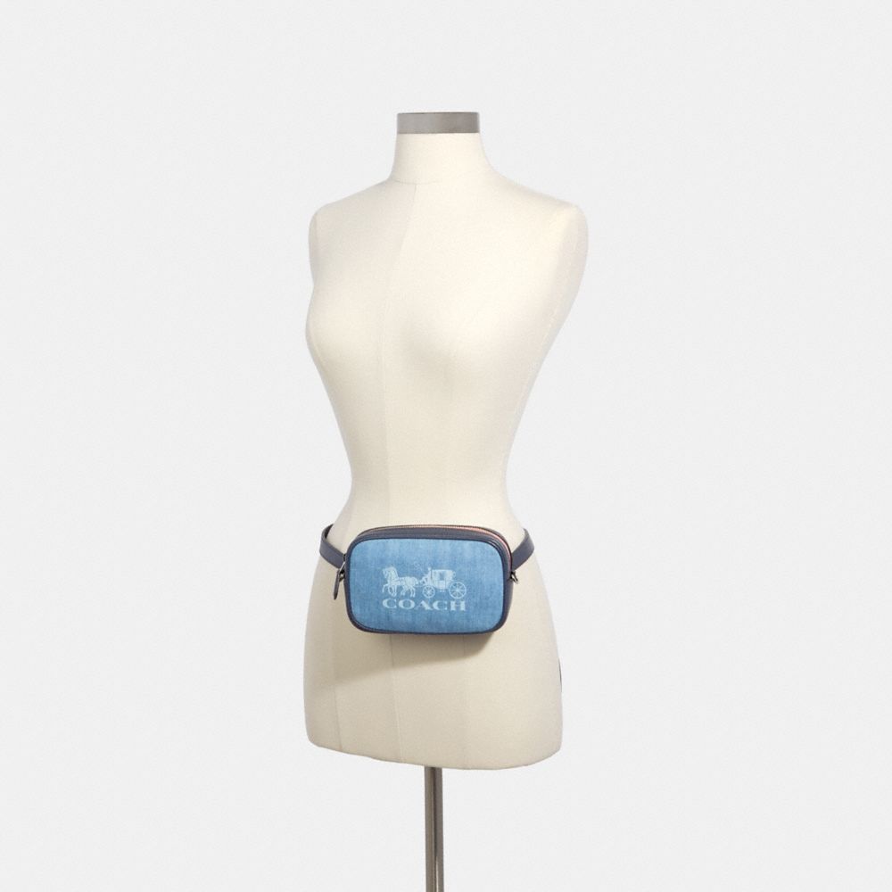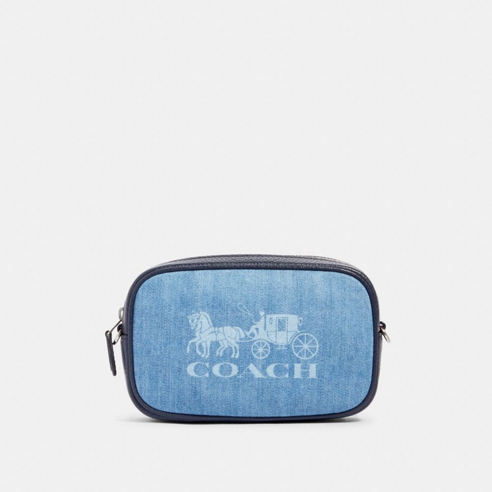 Denim and refined pebble leather| Inside multifunction pocket| Zip closure, fabric lining| Adjustable strap for wear at waist| Detachable strap with 23" drop for shoulder or crossbody wear| 7" (L) x 4 1/2" (H) x 1 3/4" (W)