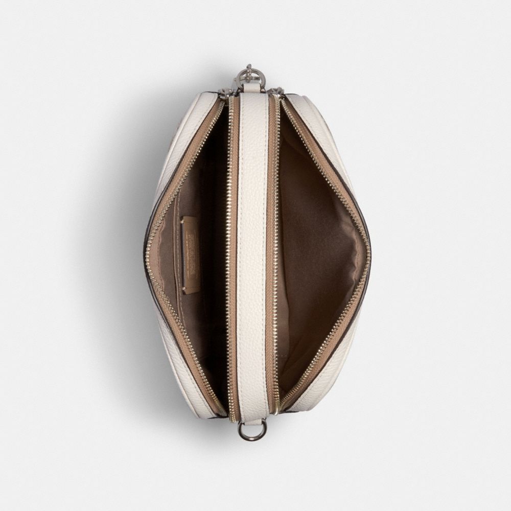 Printed coated canvas and refined pebble leather| Inside multifunction pocket| Double zip closure, fabric lining| Outside slip pocket| Detachable strap with 22" drop for shoulder or crossbody wear| 9 3/4" (L) 6 1/4" (H) x 3 1/2" (W)