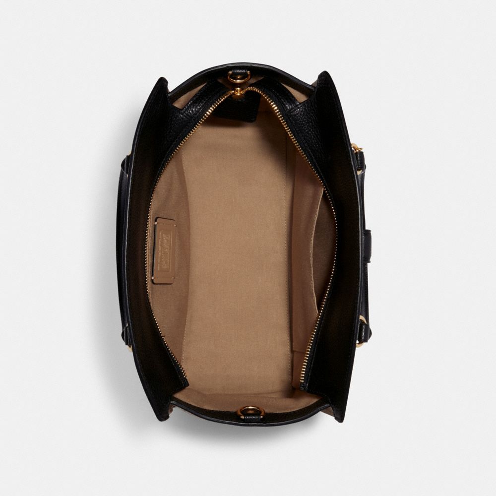 Refined pebble leather| Inside zip and multifunction pockets| Zip-top closure, fabric lining| Handles with 4" drop| Outside zip and turnlock pockets| Detachable strap with 20" drop for shoulder or crossbody wear| 11 3/4" (L) x 8" (H) x 5" (W)