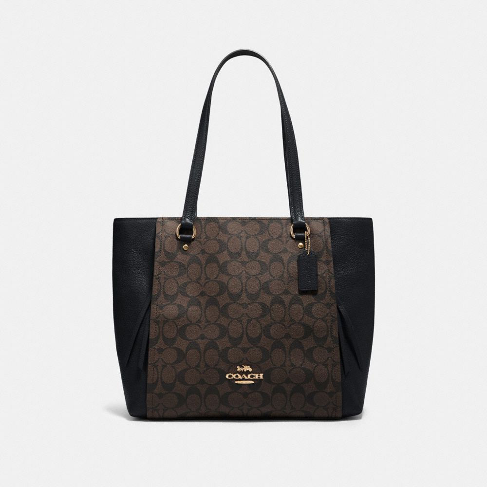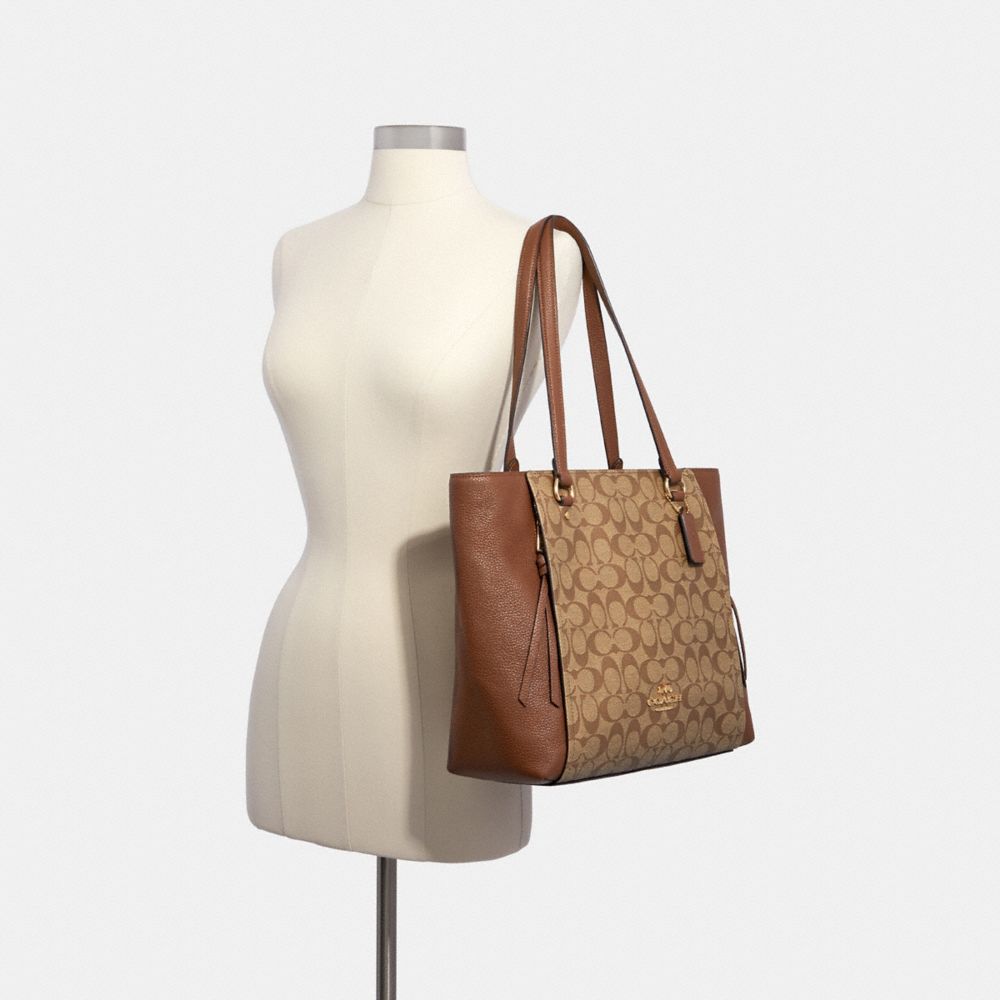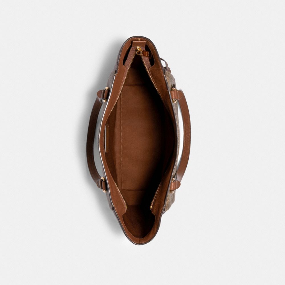 Signature coated canvas and refined pebble leather| Inside zip, cell phone and multifunction pockets| Zip-top closure, fabric lining| Handles with 10" drop| Outside zip pockets| 15 1/4" (L) x 11 1/4" (H) x 5 1/4" (W)