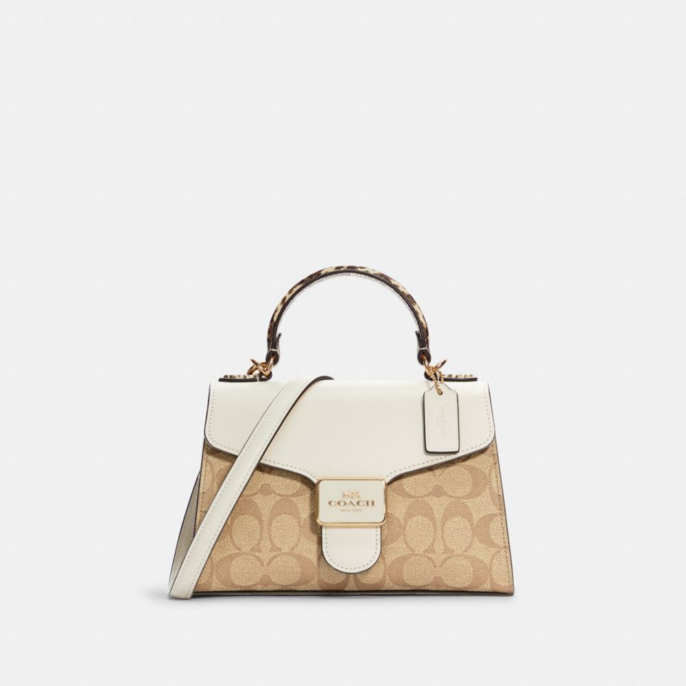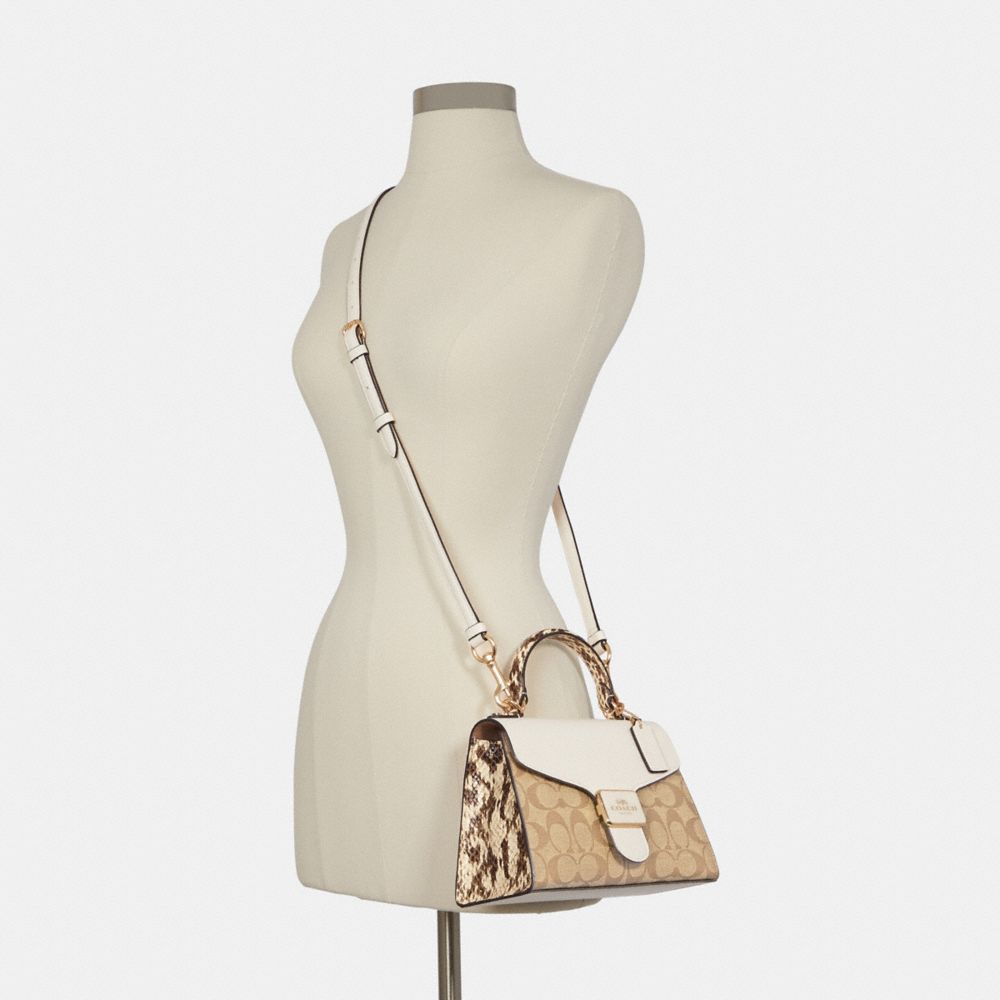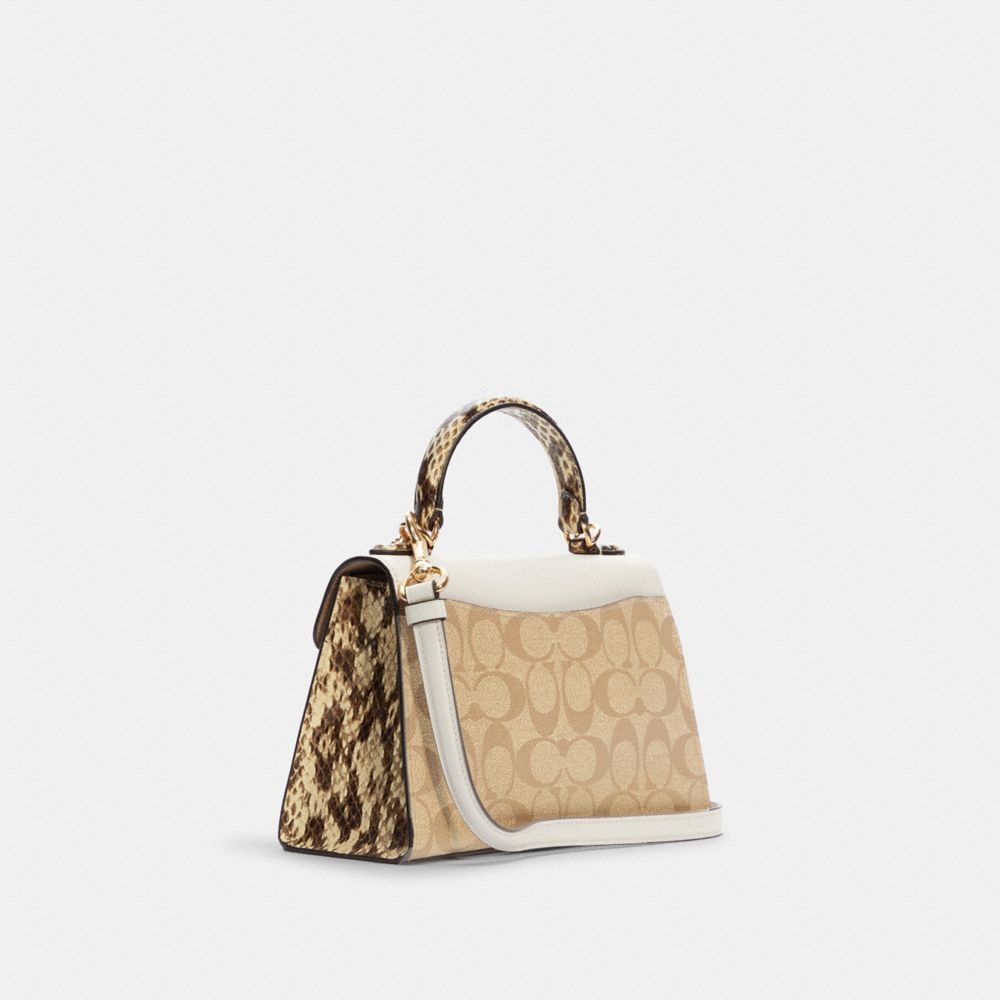 Signature coated canvas, refined calf leather and snake-embossed leather| Inside multifunction pocket| Snap closure, fabric lining| Top handle with 2 3/4" drop| Outside open pocket| Detachable strap with 22 1/2" drop for shoulder or crossbody wear| 8 3/4" (L) x 6" (H) x 4" (W)Style No. C1325