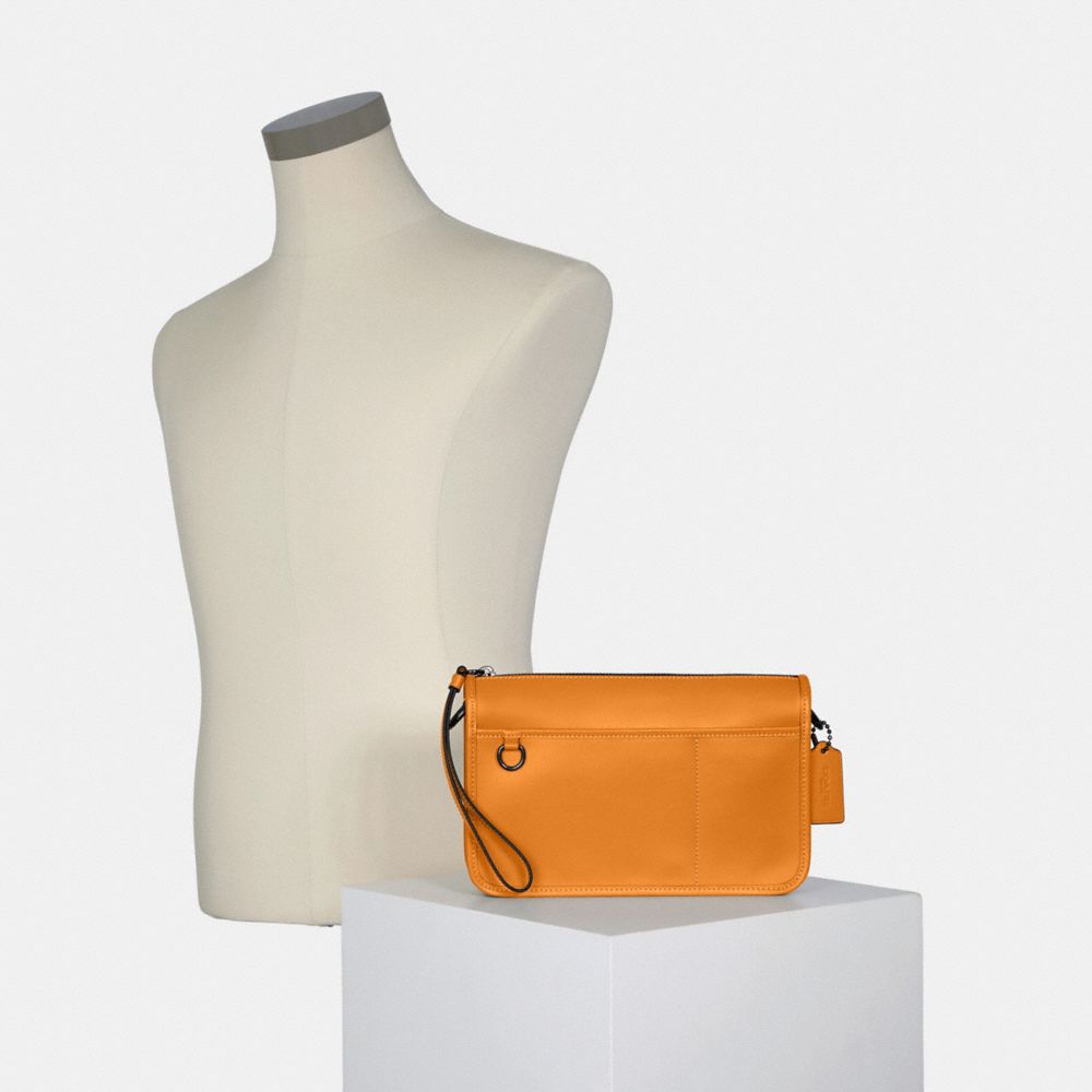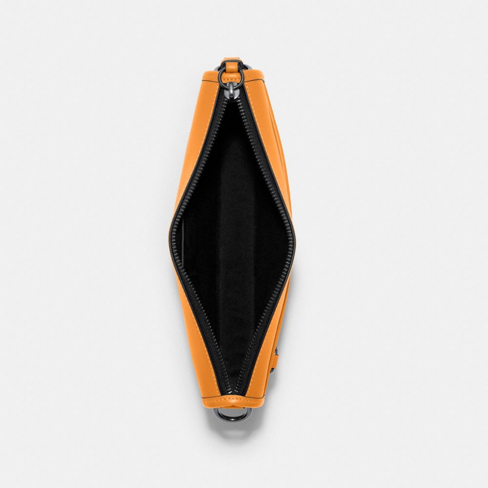 Refined calf leather| Zip-top closure, fabric lining| Outside open pocket| Attached wrist strap| Detachable strap with 22" drop for shoulder or crossbody wear| 9 3/4" (L) x 6 1/4" (H) x 2" (W)