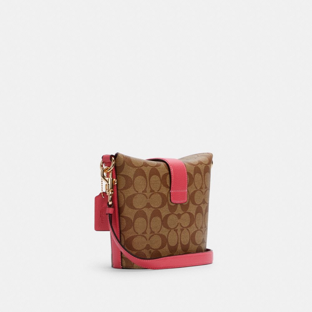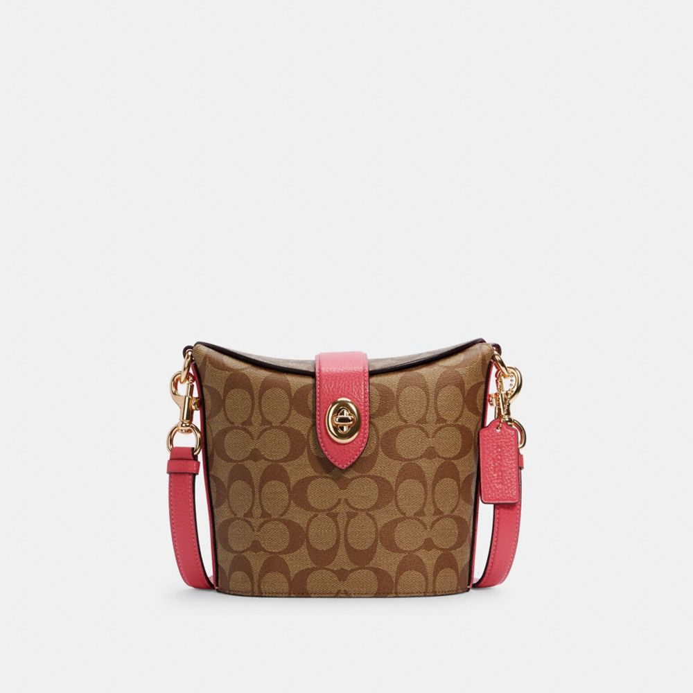 Signature coated canvas and refined pebble leather| Inside multifunction pocket| Turnlock closure, fabric lining| Detachable strap with 22 1/2" drop for shoulder or crossbody wear| 7" (L) x 7" (H) x 3 1/2" (W)