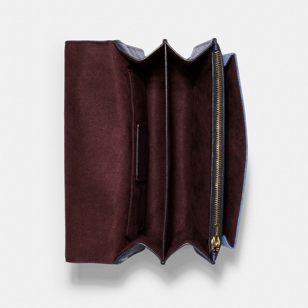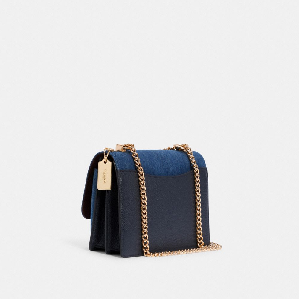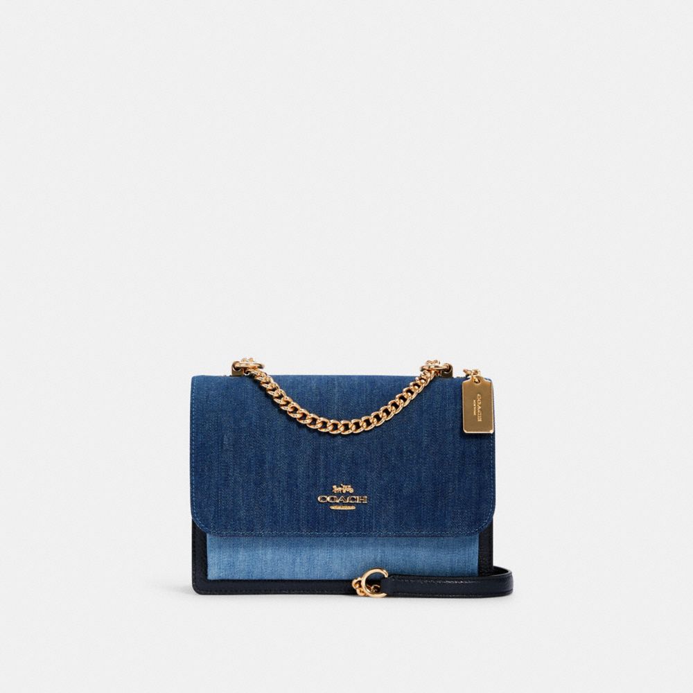Denim and refined pebble leather| Inside zip and multifunction pockets| Snap closure, fabric lining| Outside slip pocket| Strap with 22" drop doubles up for three ways to wear: short or long on the shoulder or crossbody style| 8 1/2" (L) x 6 1/4" (H) x 2 3/4" (W)