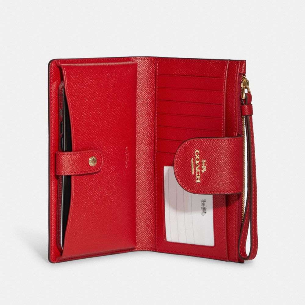 Crossgrain leather| Six credit card slots| ID window| Snap phone compartment| Snap closure| Outside zip pocket| Attached wrist strap| 7 1/4" (L) x 4 1/2" (H)| Fits all iPhone and Samsung Galaxy phonesStyle No. C2869
