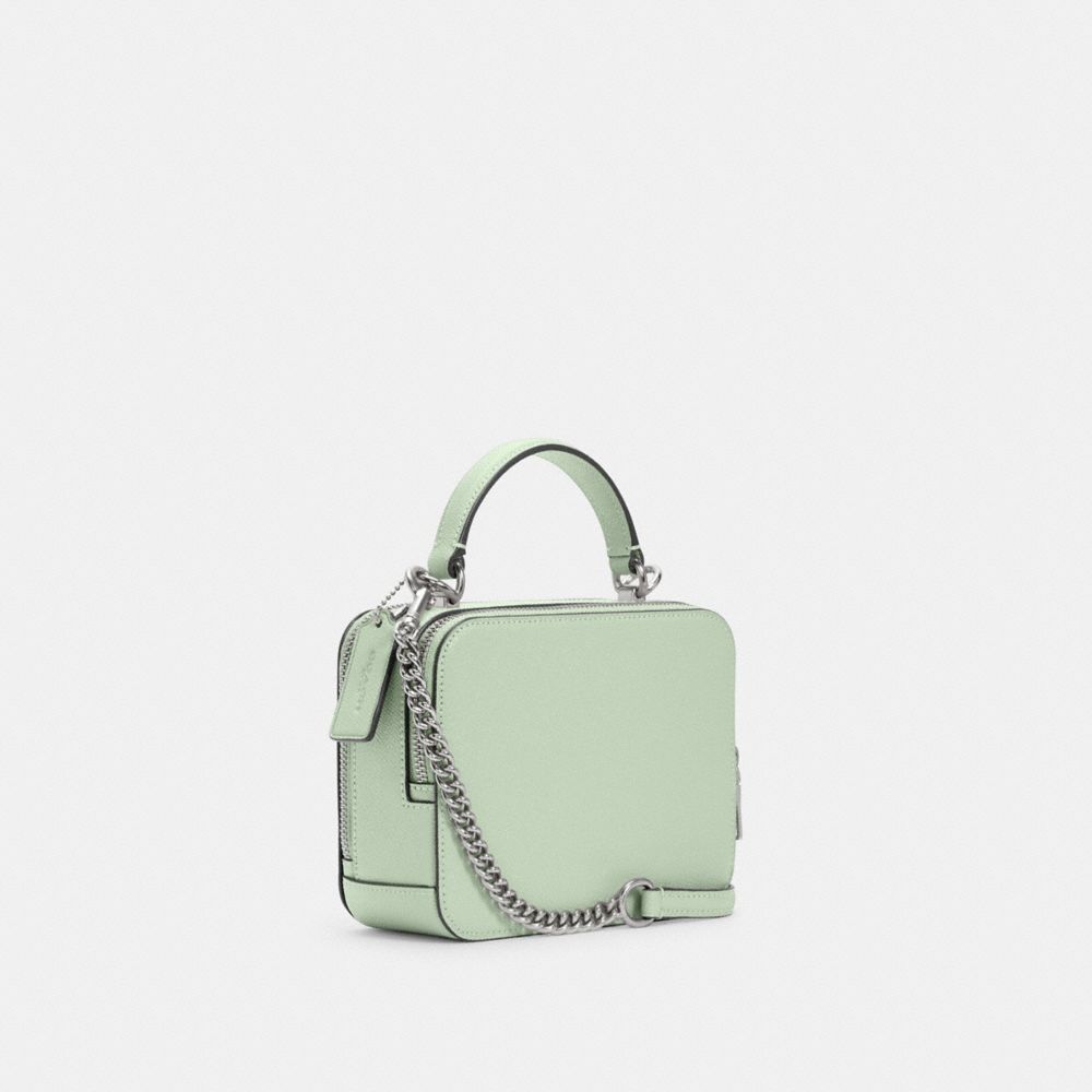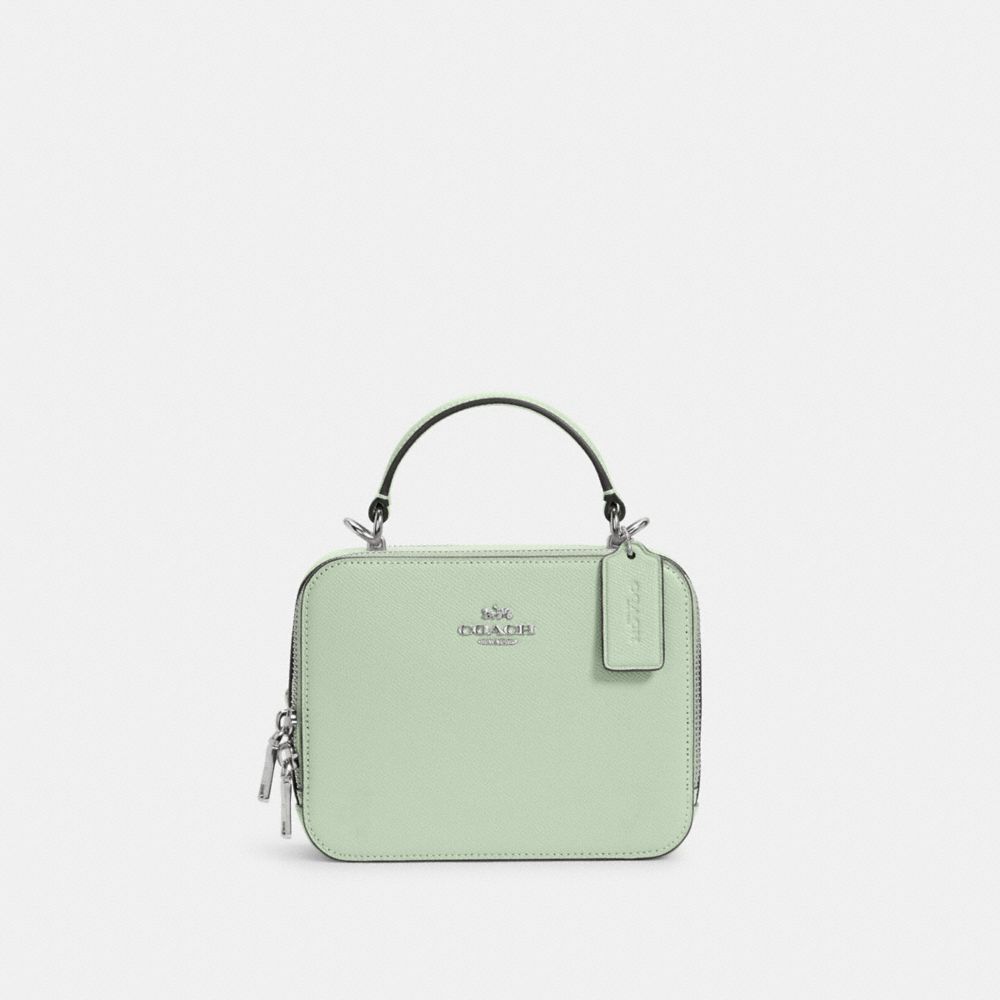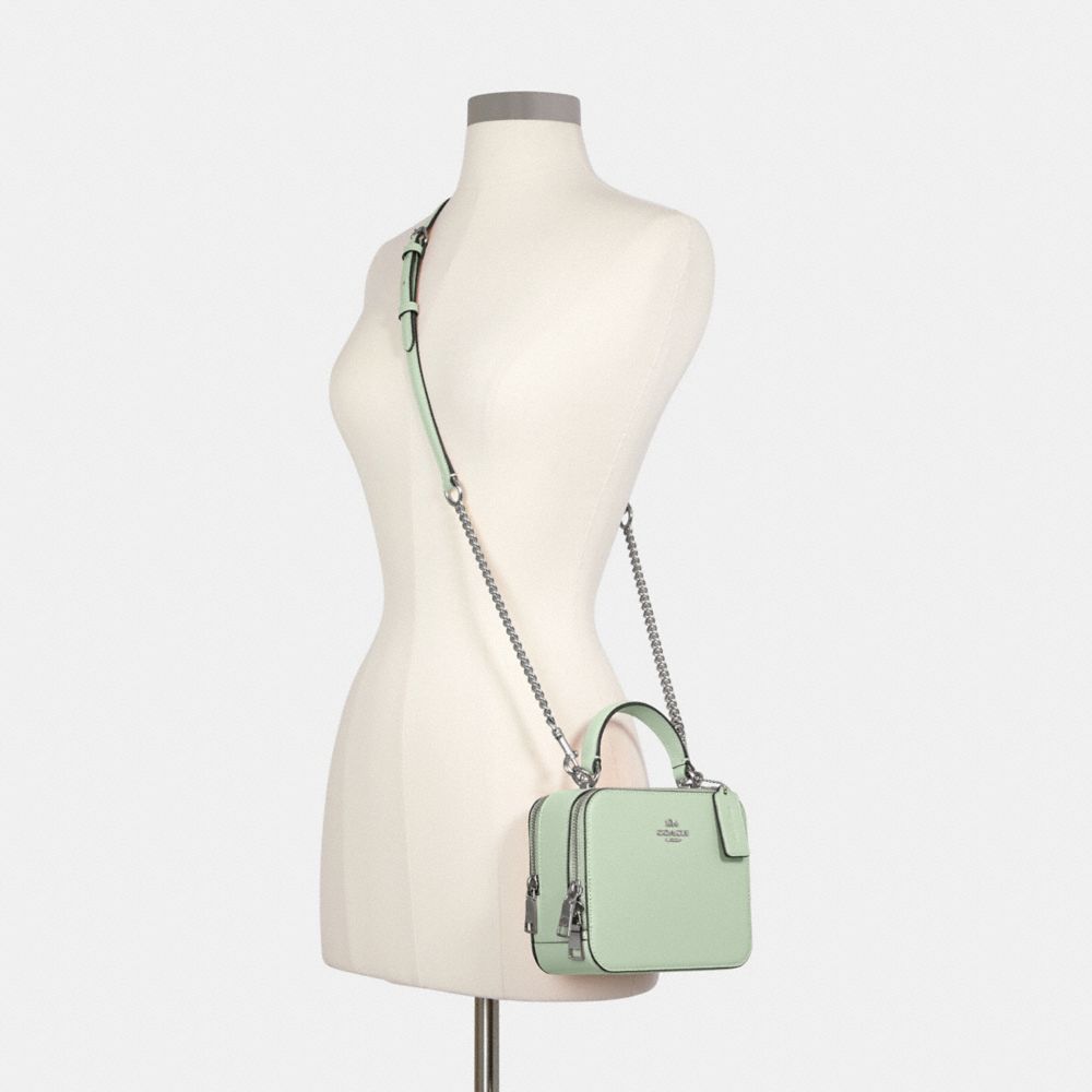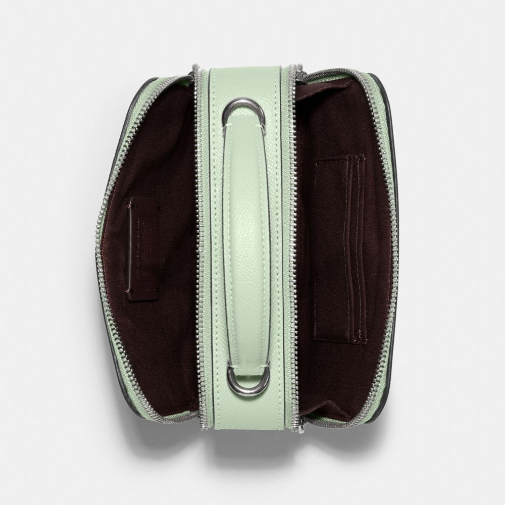 Crossgrain leather| Double zip closure, fabric lining| Top handle with 1/2" drop| Detachable strap with 22 1/2" drop for shoulder or crossbody wear| 7" (L) x 5 1/2" (H) x 2 1/2" (W)