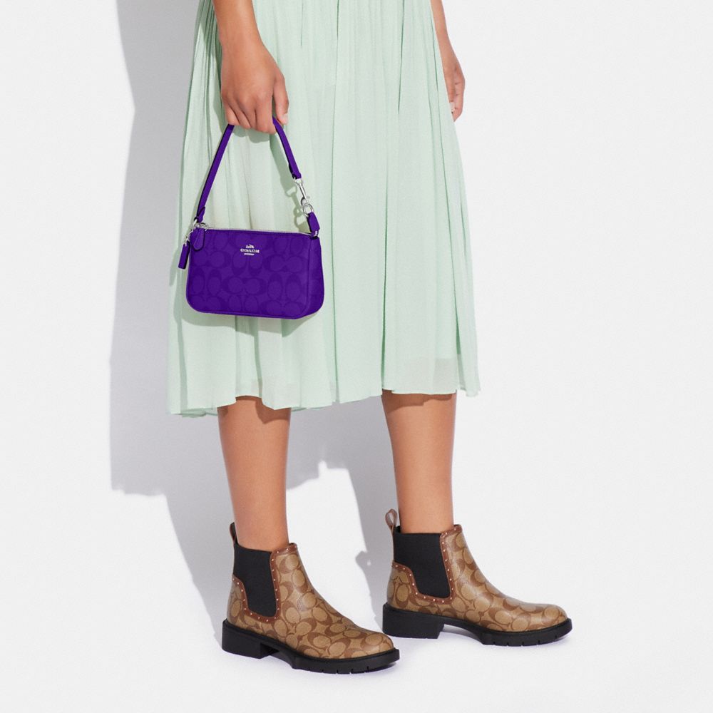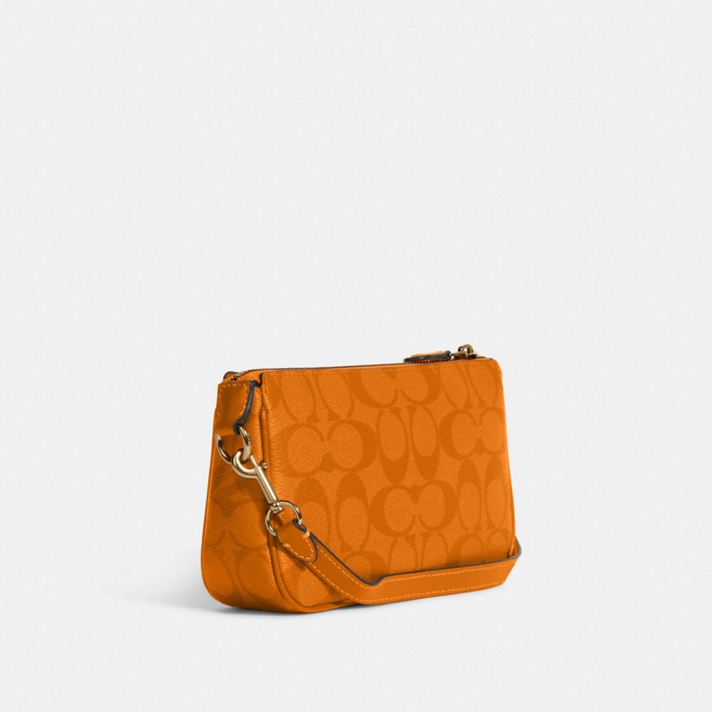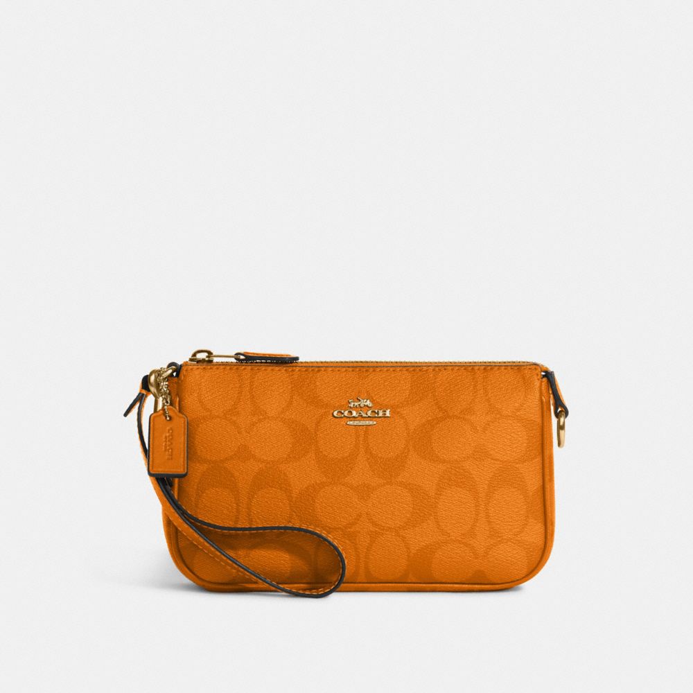 Signature coated canvas and smooth leather| Two credit card slots| Inside multifunction pocket| Zip-top closure, fabric lining| Handle with 6 1/4" drop| 7 1/2" (L) x 4 1/2" (H) x 2" (W)Style No. C3308