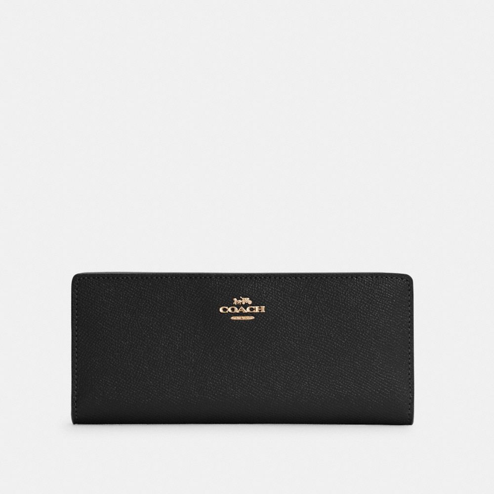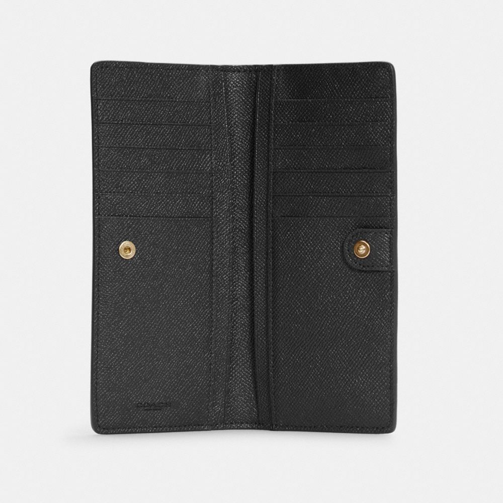 Crossgrain leather| 12 credit card slots| Full-length bill compartments| Snap closure| Outside zip pocket| Wrist strap attached| 7 1/4" (L) x 3 1/2" (H) x 1/2 (W)