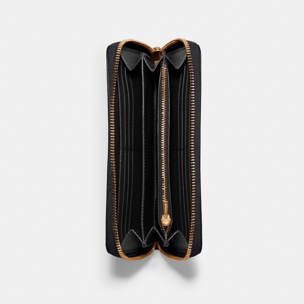 Crossgrain leather| Twelve credit card slots| Full-length bill compartments| Inside zip coin pocket| Zip-around closure| Detachable wrist strap| 7 1/2" (L) x 4" (H) x 1" (W)