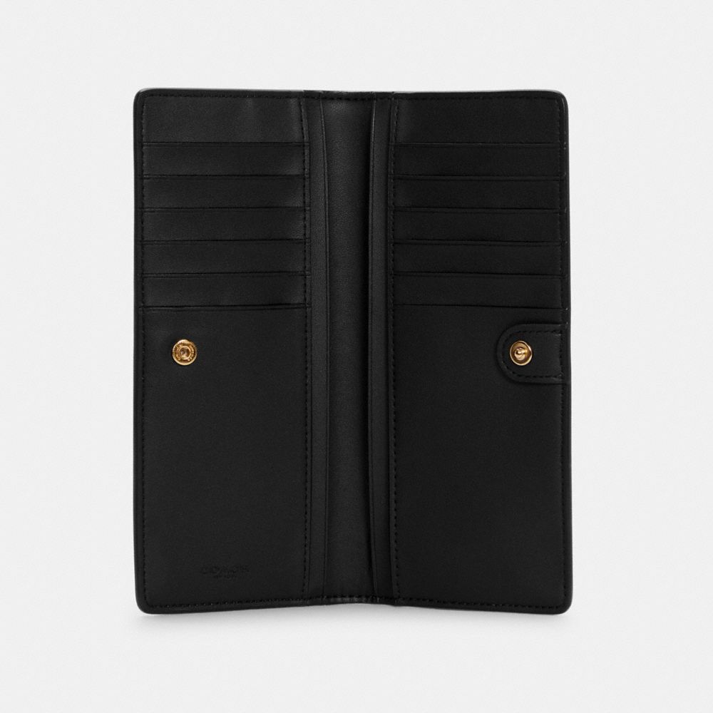 Signature coated canvas and smooth leather| 12 credit card slots| Full-length bill compartments| Snap closure| Outside zip pocket| Wrist strap attached| 7 1/4" (L) x 3 1/2" (H) x 1/2 (W)