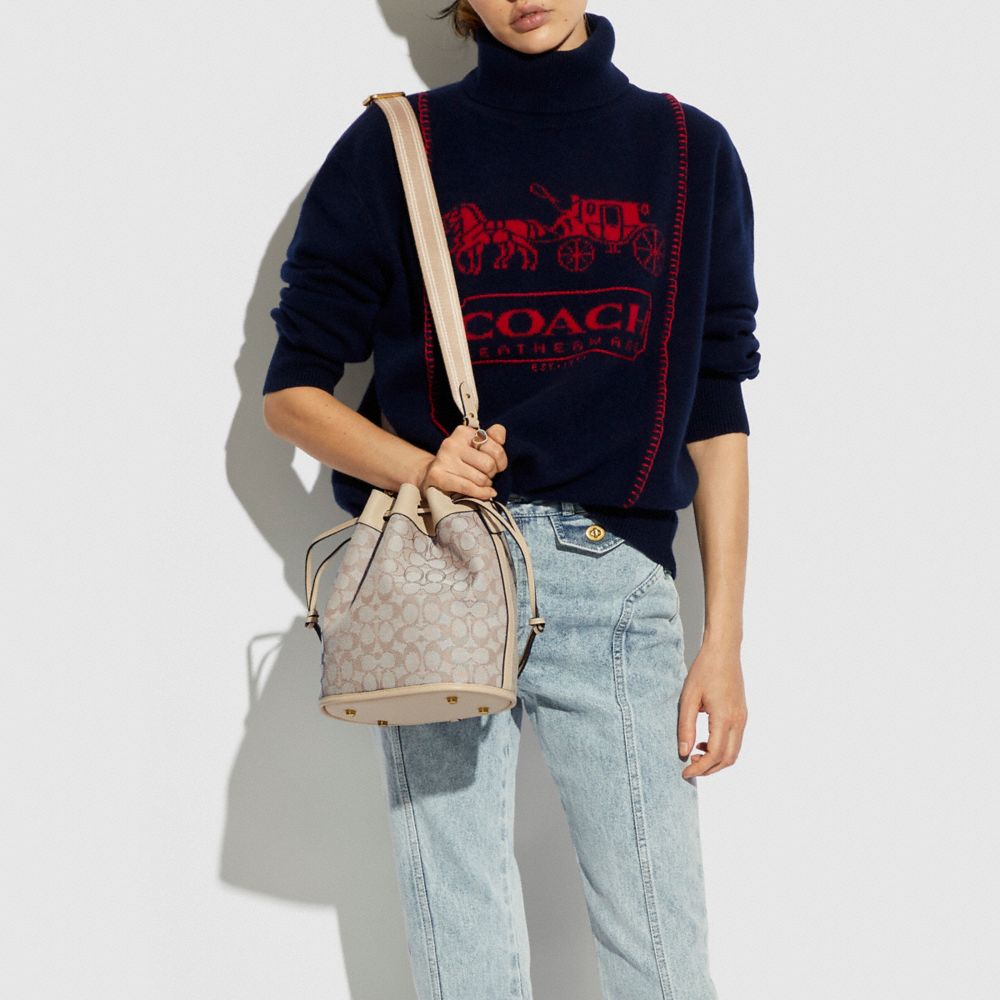 Signature jacquard and glovetanned leather| Inside zip pocket| Drawstring closure, fabric lining| Detachable handle with 5 3/4" drop| Detachable strap with 24 1/2" drop for shoulder or crossbody wear| Four protective feet at base| 8 3/4" (L) x 9 3/4" (H) x 5 1/2" (W)Style No. C3853
