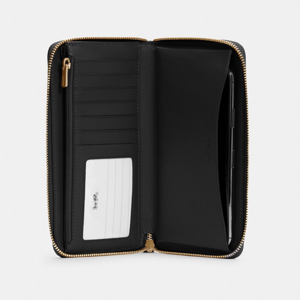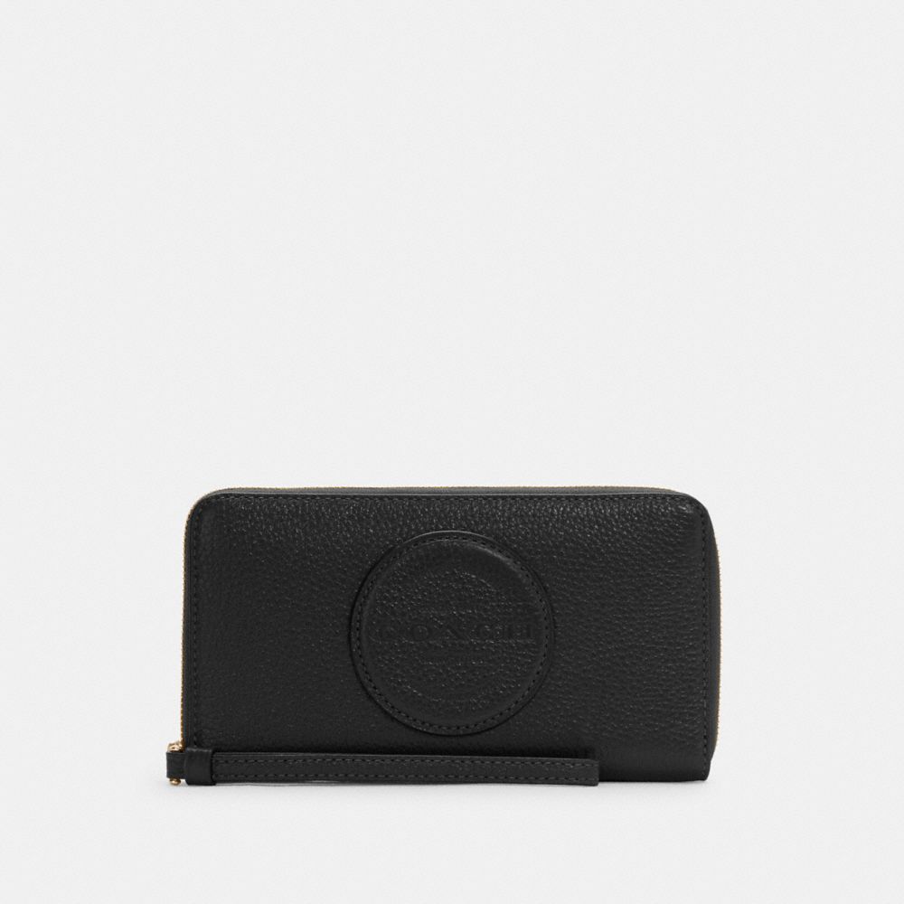 Refined pebble leather| Six credit card slots| ID window| Zip coin pocket| Inside phone pocket| Zip-around closure| Wrist strap attached| 7 1/4" (L) x 4" (H) x 3/4" (W)