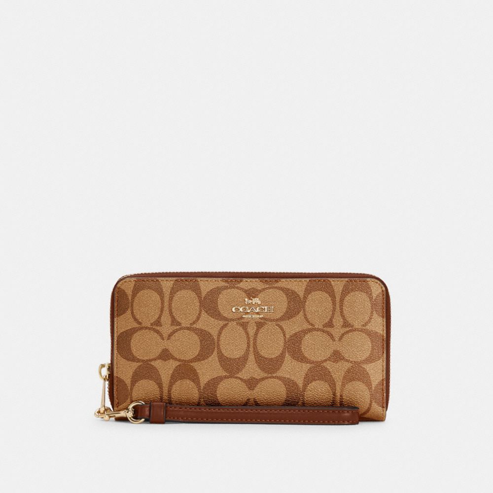 Signature coated canvas and smooth leather| Twelve credit card slots| Full-length bill compartments| Inside zip coin pocket| Zip-around closure| Detachable wrist strap| 7 1/2" (L) x 4" (H) x 1" (W)