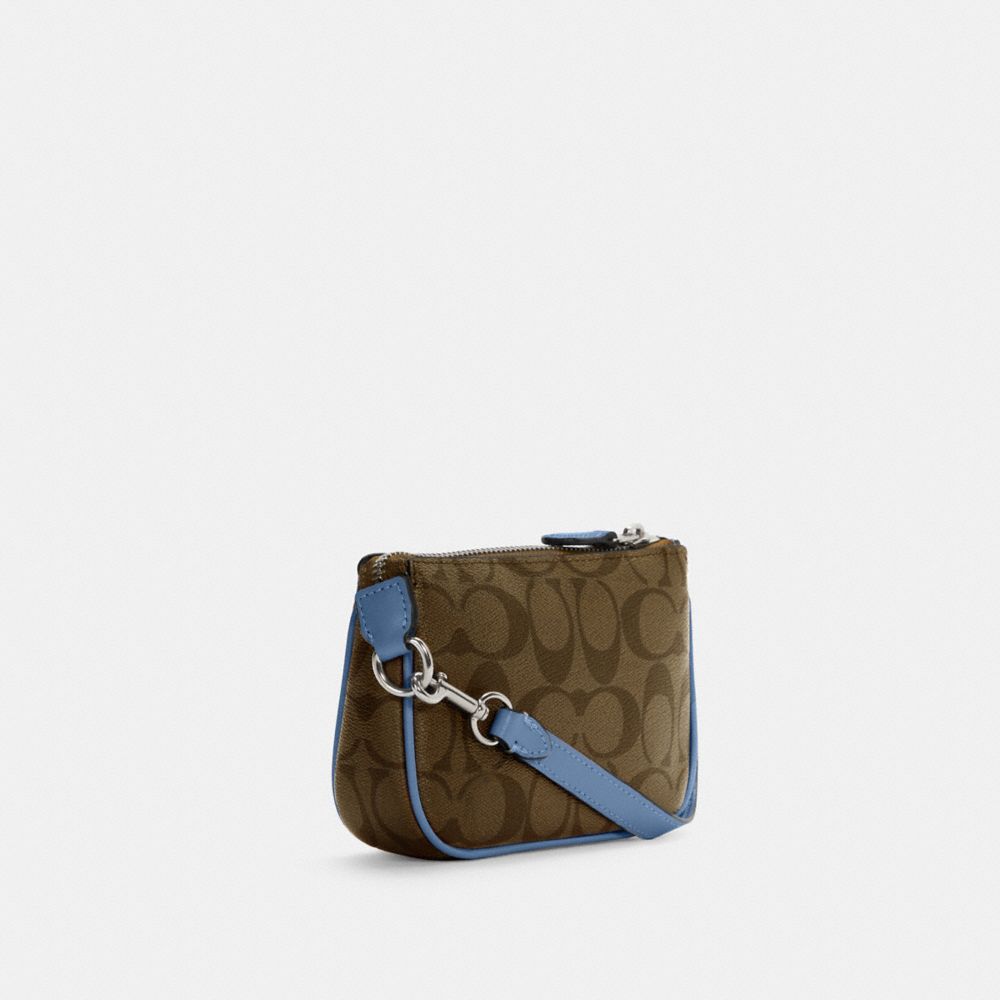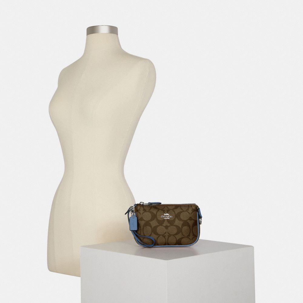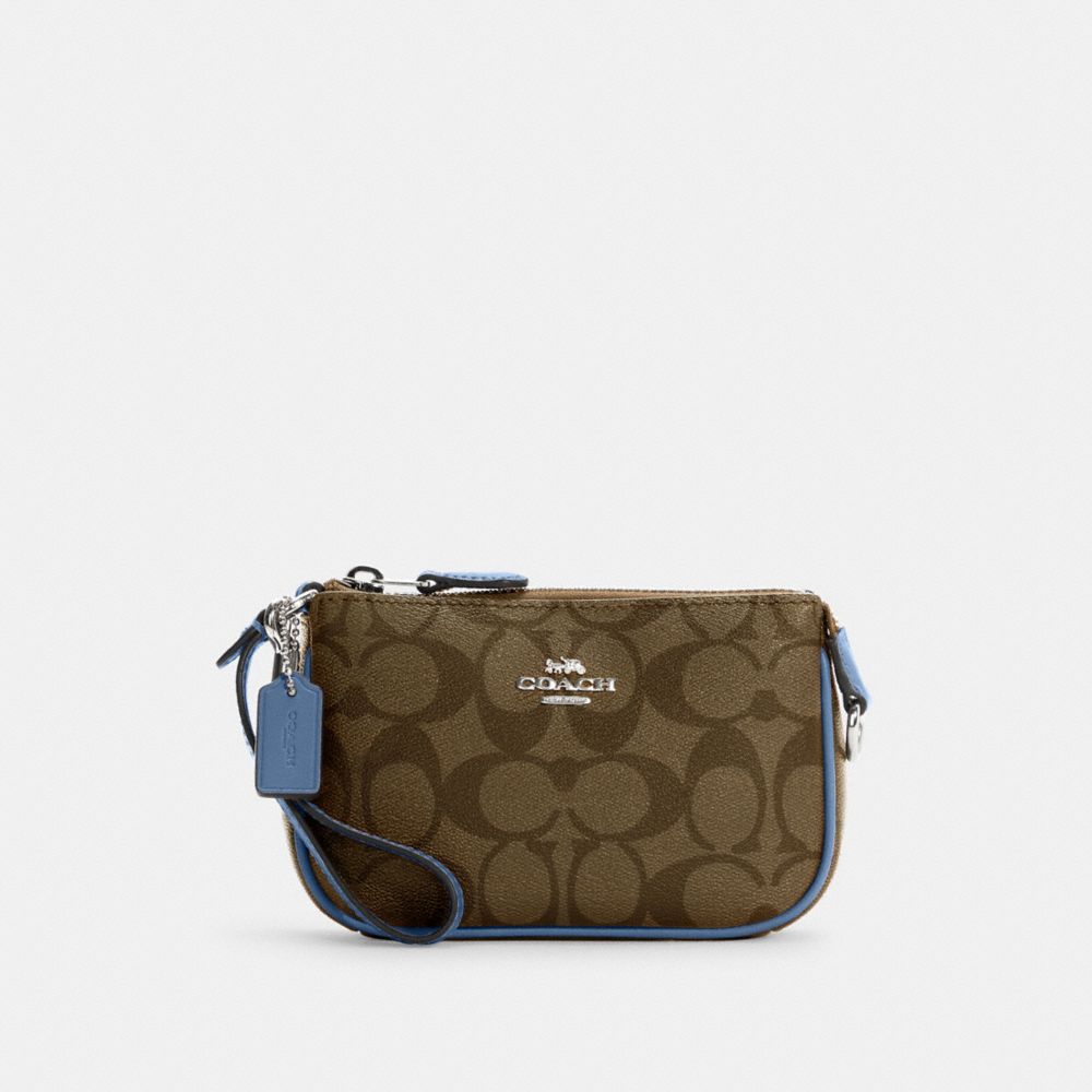 Signature coated canvas and smooth leather| Two credit card slots| Zip-top closure, fabric lining| Handle with 4 1/2" drop| 6" (L) x 4" (H) x 1 1/2" (W)Style No. C4580