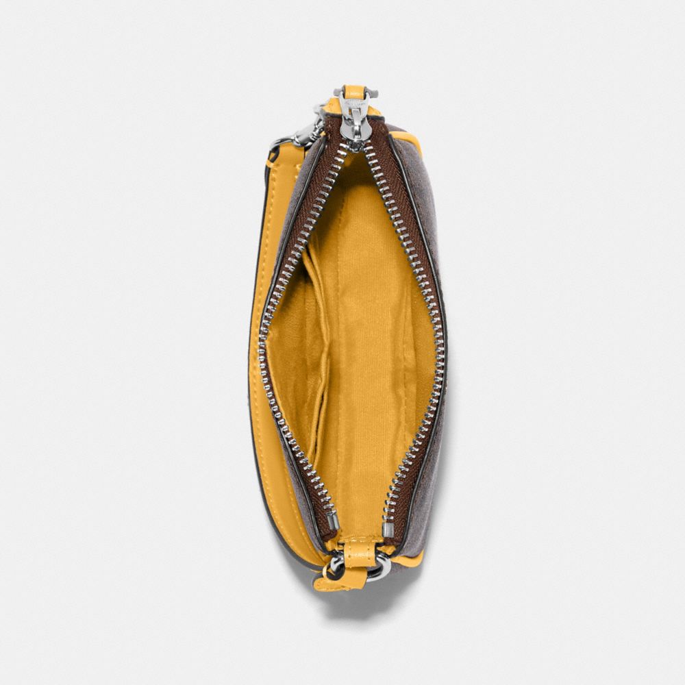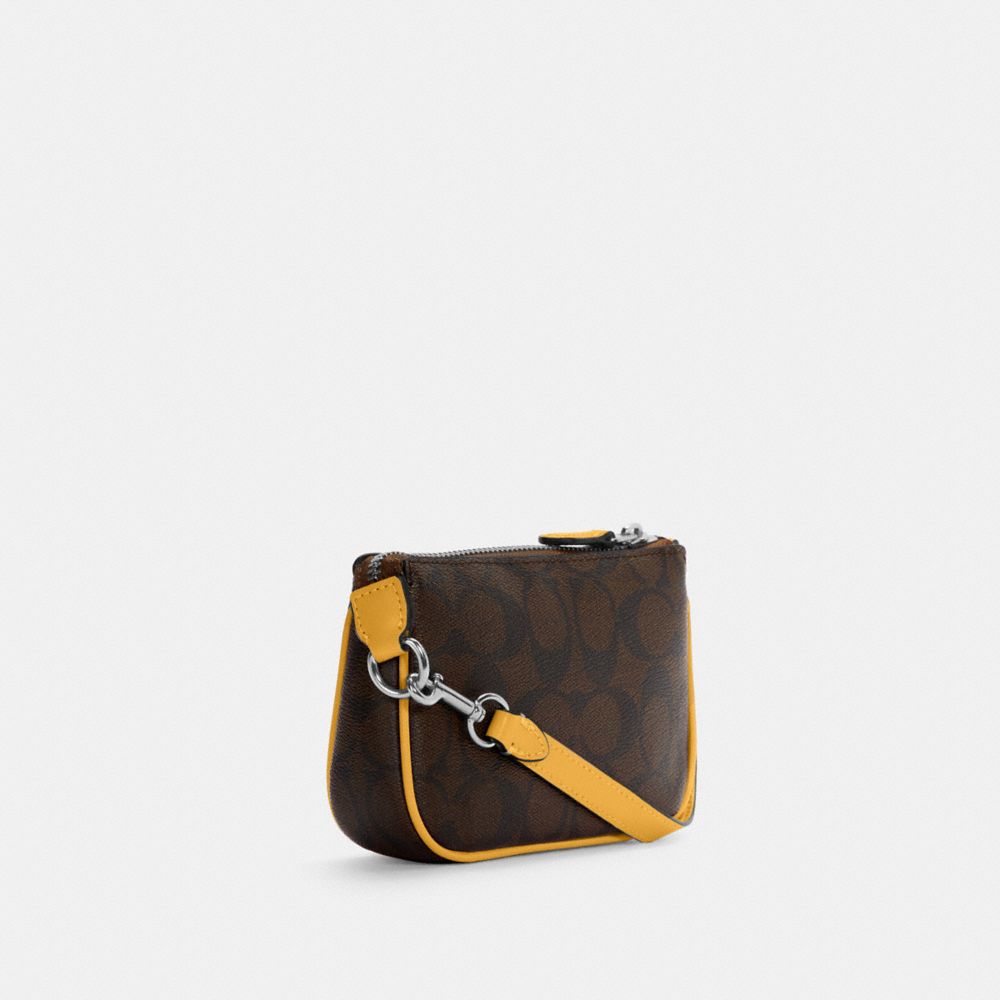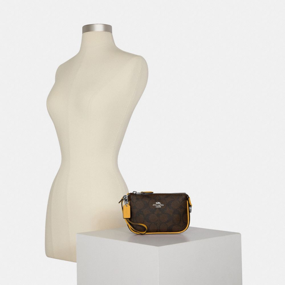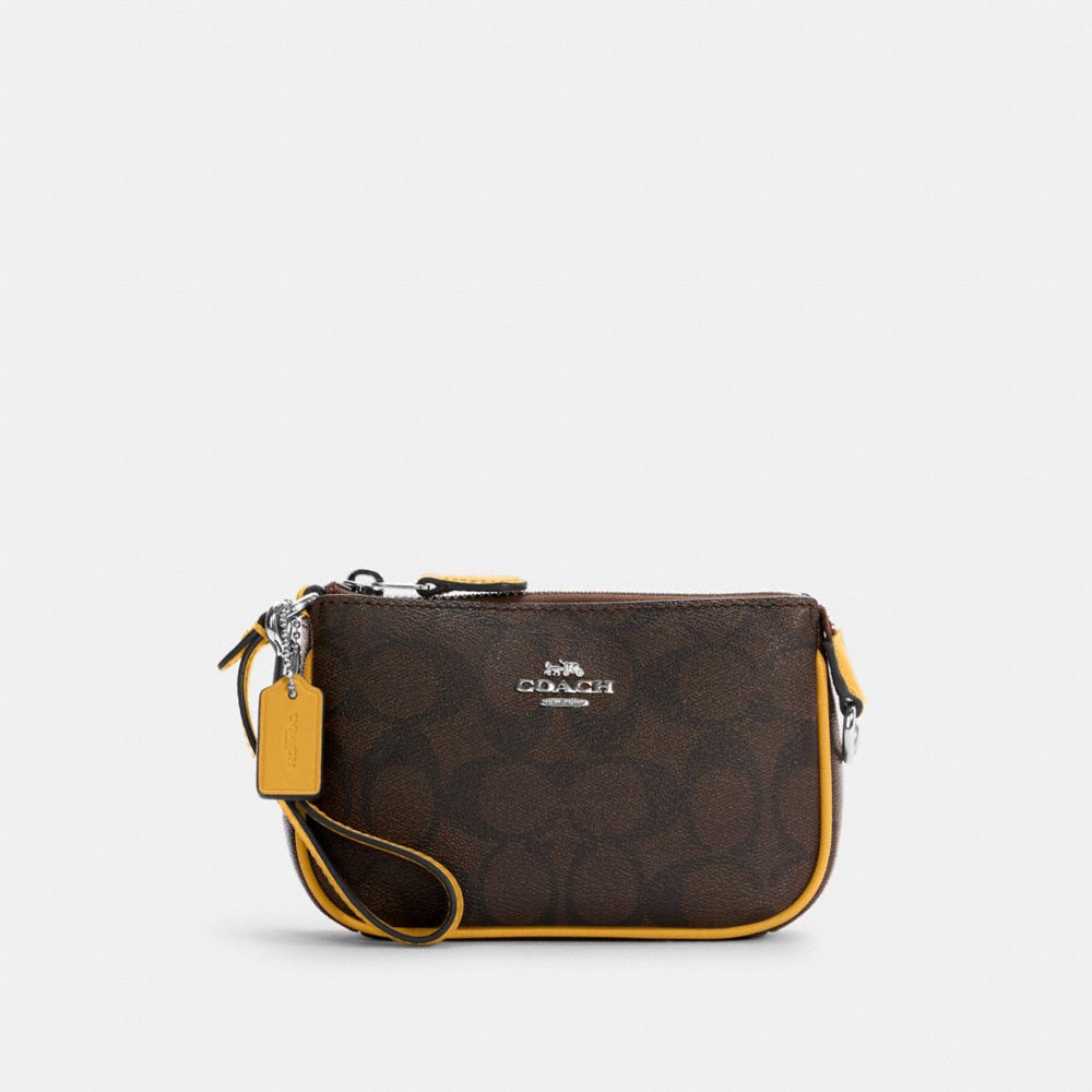 Signature coated canvas and smooth leather| Two credit card slots| Zip-top closure, fabric lining| Handle with 4 1/2" drop| 6" (L) x 4" (H) x 1 1/2" (W)Style No. C4580
