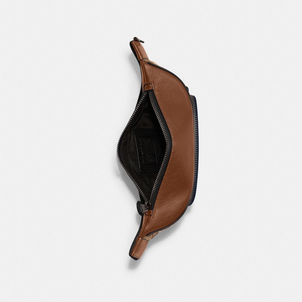Signature jacquard and refined pebble leather| Inside multifunction pocket| Zip closure, fabric lining| Outside zip pocket| Adjustable strap for wear at waist| 12 3/4" (L) x 6 1/4" (H)