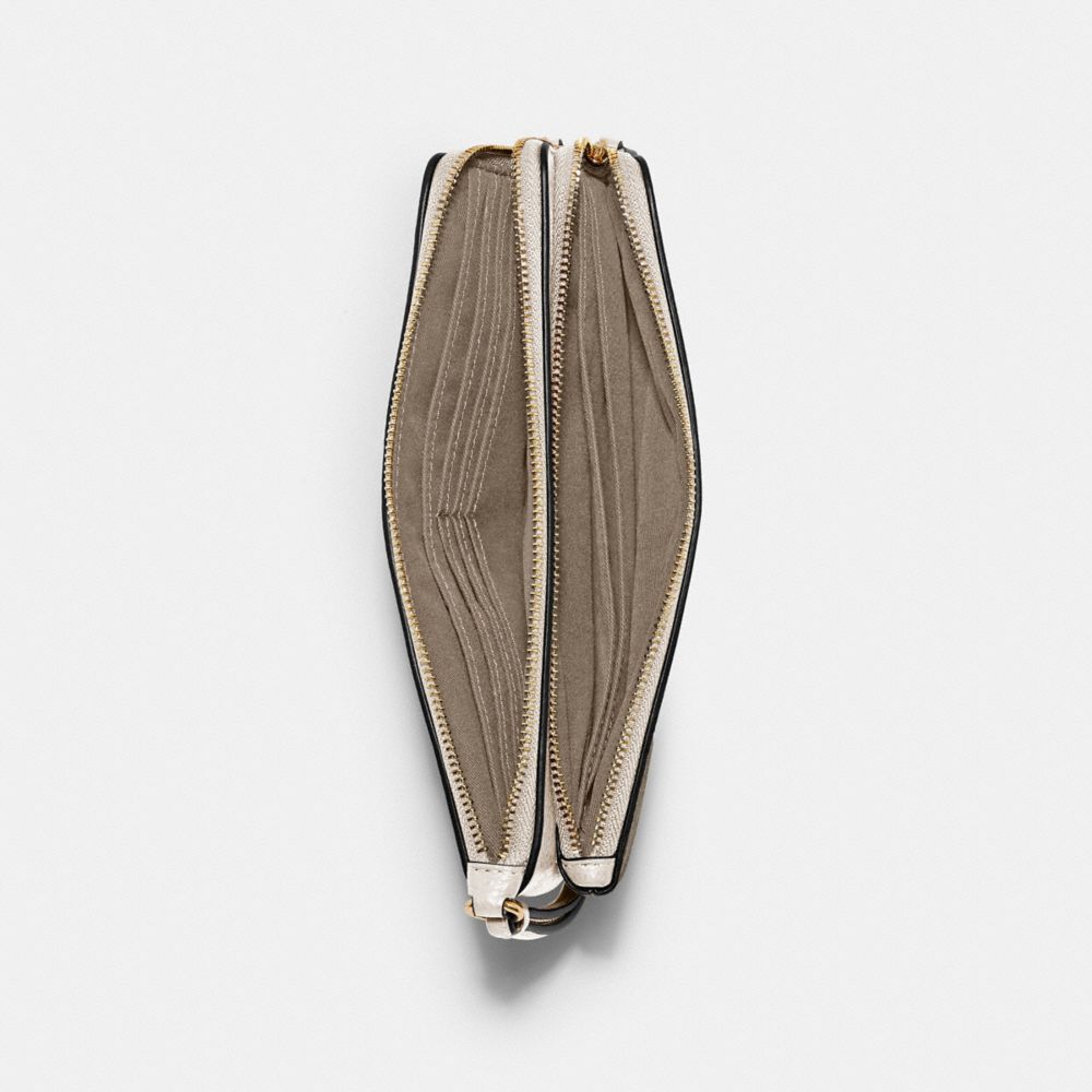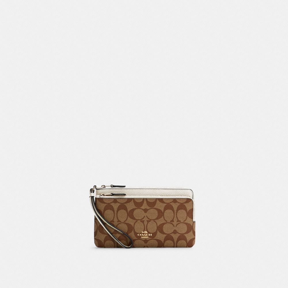 Signature coated canvas and refined pebble leather| Six credit card slots| Full-length bill compartment| Inside open pockets| Double zip closure, fabric lining| Wrist strap attached| 8" (L) x 4 3/4" (H) x 1 1/4" (W)| Fits all phone sizes up to an iPhone X and Samsung S7 Edge