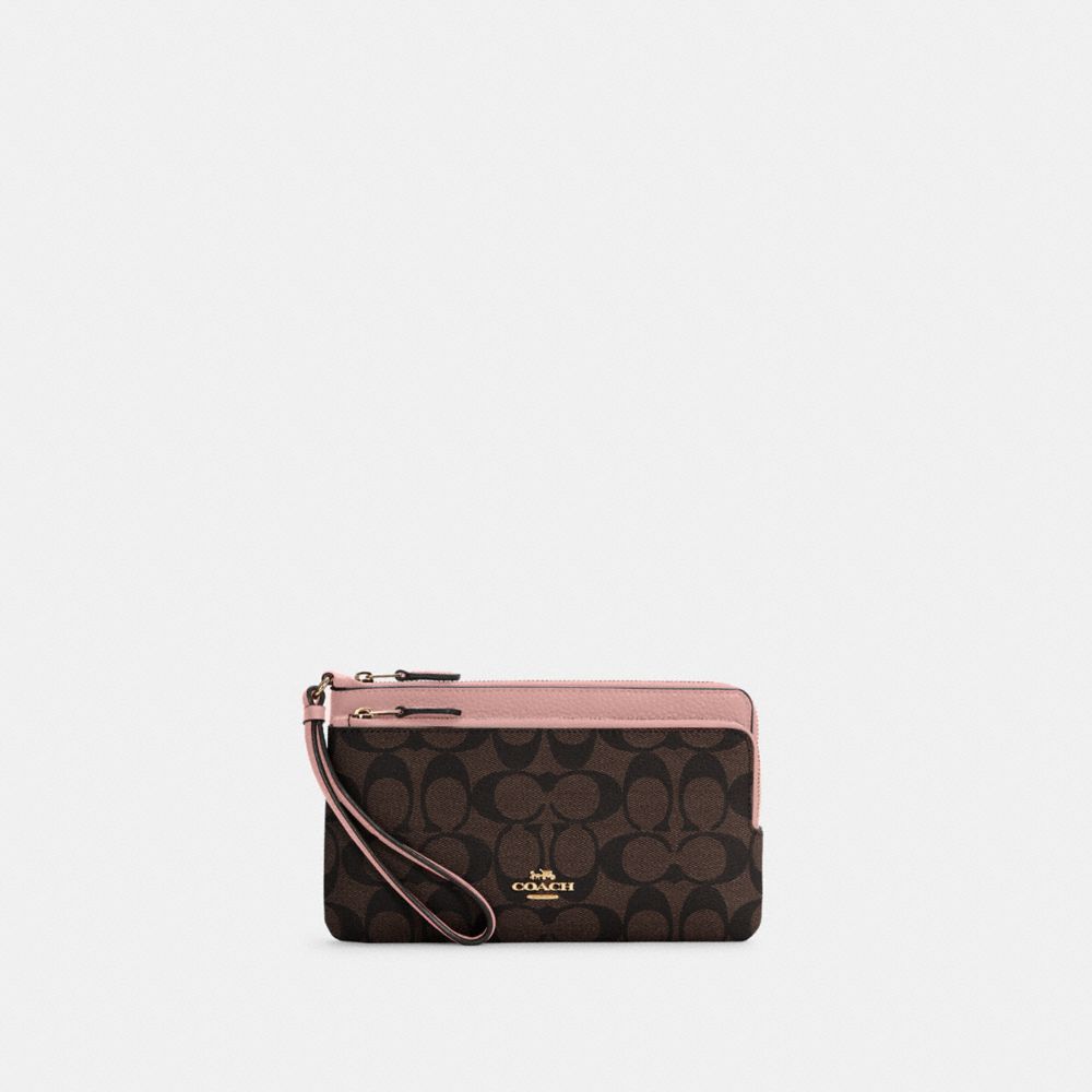 Signature coated canvas and refined pebble leather| Six credit card slots| Full-length bill compartment| Inside open pockets| Double zip closure, fabric lining| Wrist strap attached| 8" (L) x 4 3/4" (H) x 1 1/4" (W)| Fits all phone sizes up to an iPhone X and Samsung S7 EdgeStyle No. C5576