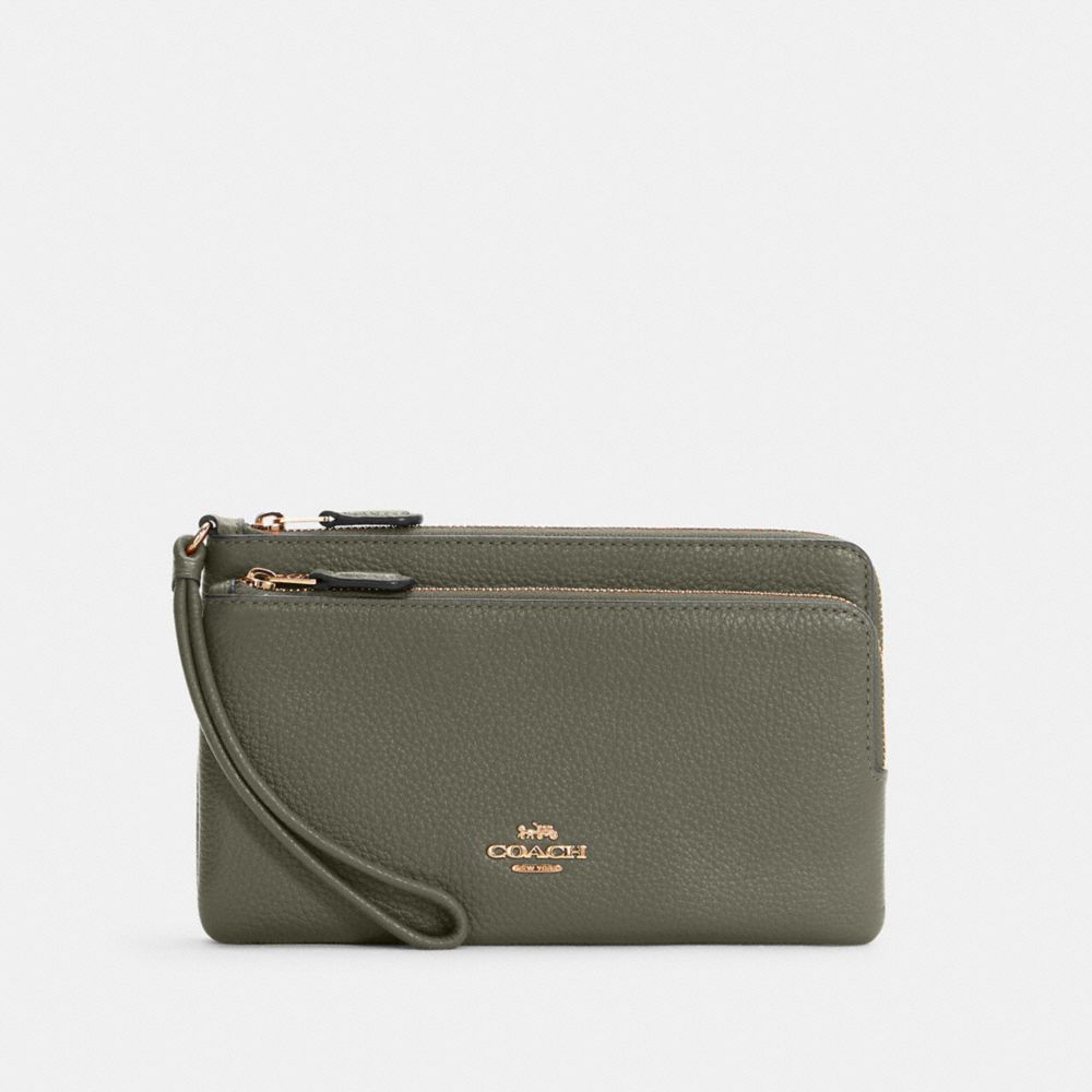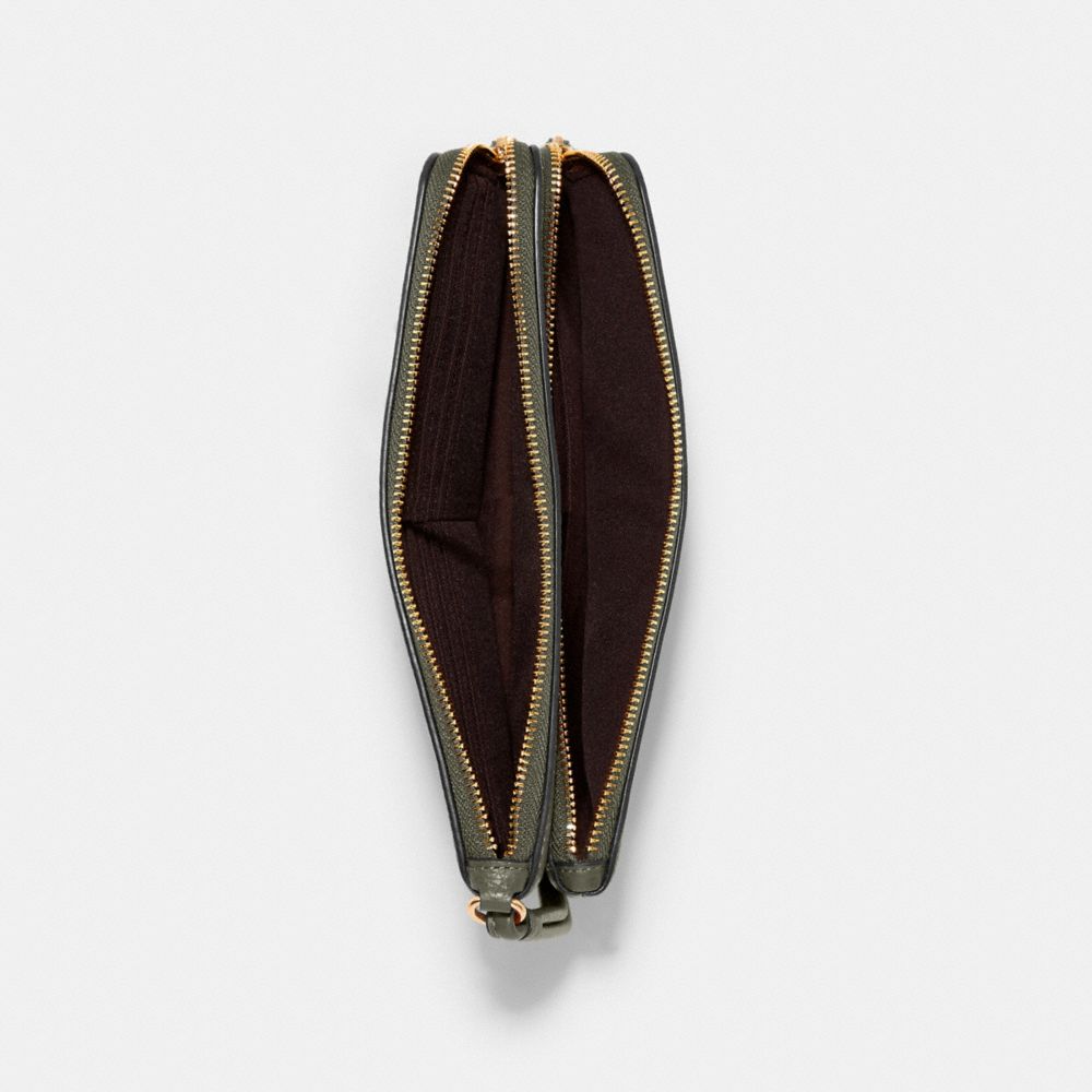 Refined pebble leather| Eight credit card slots| Inside open pockets| Double zip closure, fabric lining| Wrist strap attached| 8" (L) x 4 3/4" (H) x 1" (W)| Fits all phone sizes up to an iPhone X and Samsung S7 EdgeStyle No. C5610