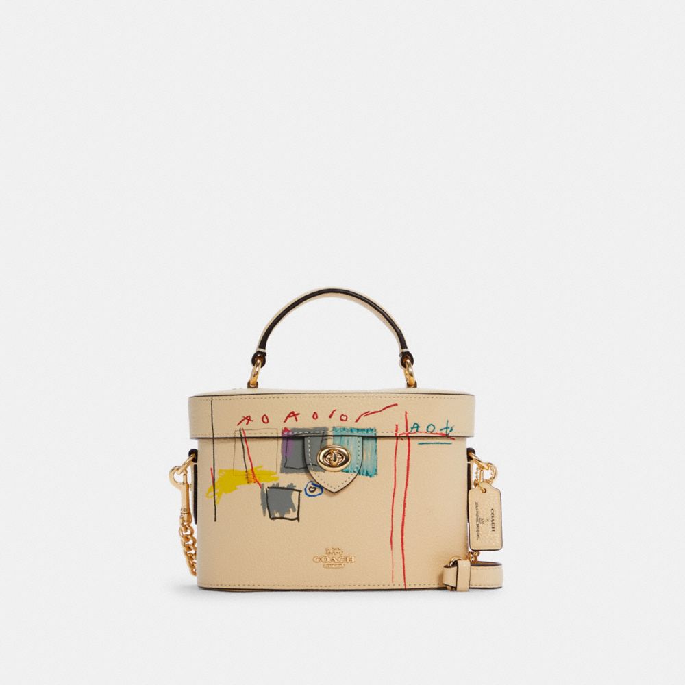 Refined pebble leather| Inside multifunction pocket| Turnlock closure, fabric lining| Top handle with 2 1/2" drop| Detachable strap with 23 1/4" drop for shoulder or crossbody wear| 7 3/4" (L) x 5 1/4" (H) x 3 3/4" (W)| Coach celebrates and honors renowned New York City artist Jean-Michel Basquiat with a special collection featuring elements from his revolutionary works of art.| © ESTATE OF JEAN-MICHEL BASQUIAT. LICENSED BY ARTESTAR, NEW YORK