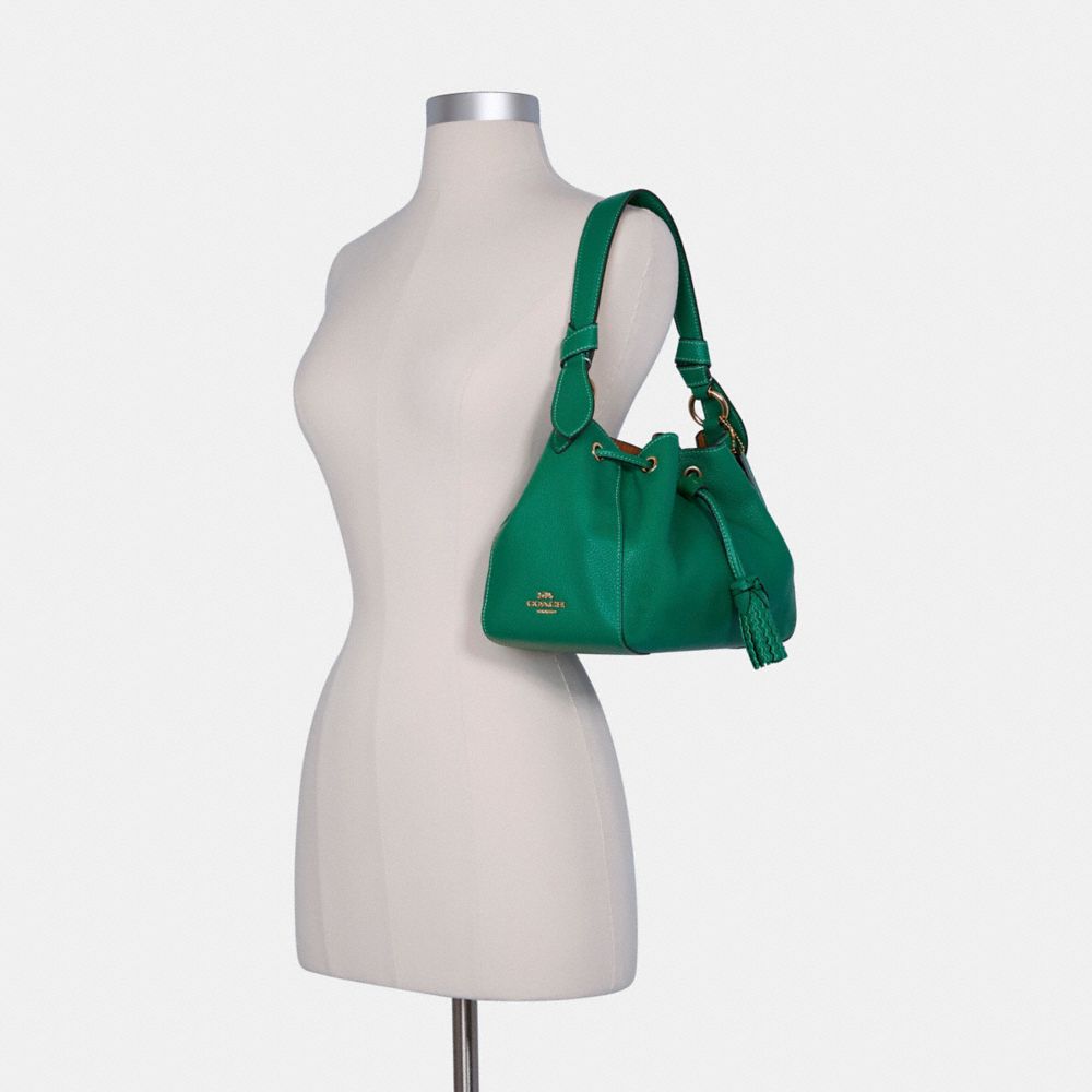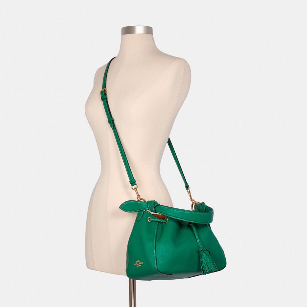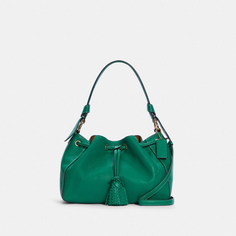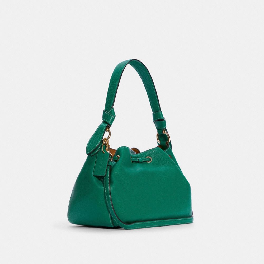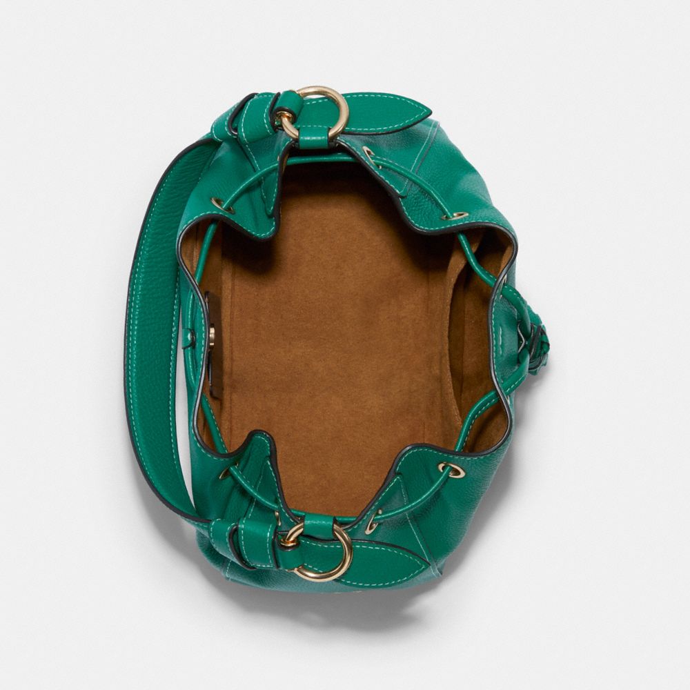 Refined pebble leather| Inside zip and multifunction pockets| Drawstring and snap closures, fabric lining| Handle with 8 1/2" drop| Detachable strap with 22 1/2" drop for shoulder or crossbody wear| 10 3/4" (L) x 6 1/2" (H) x 5" (W)Style No. C5671