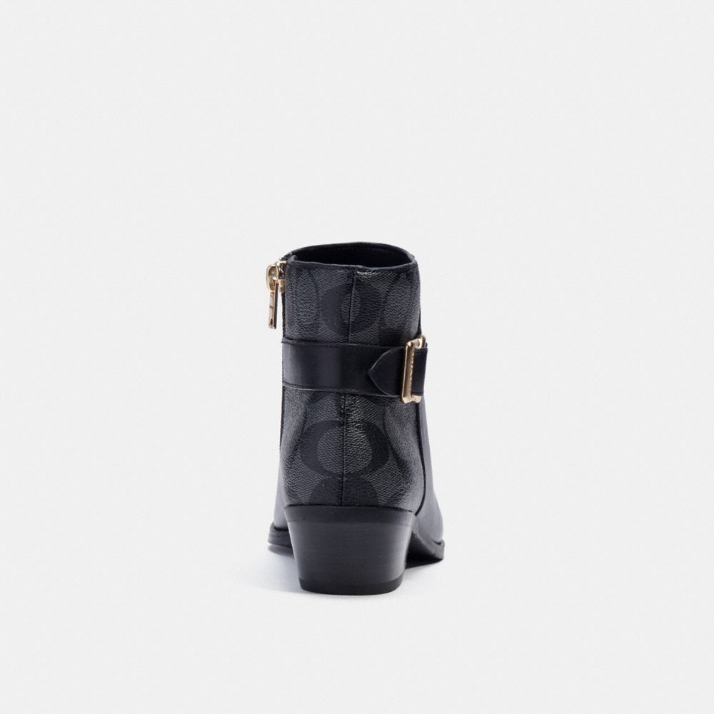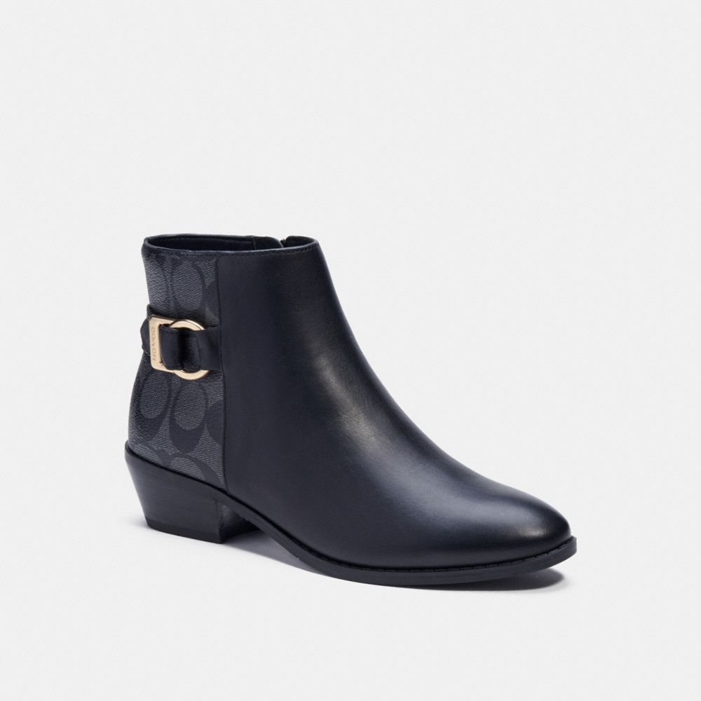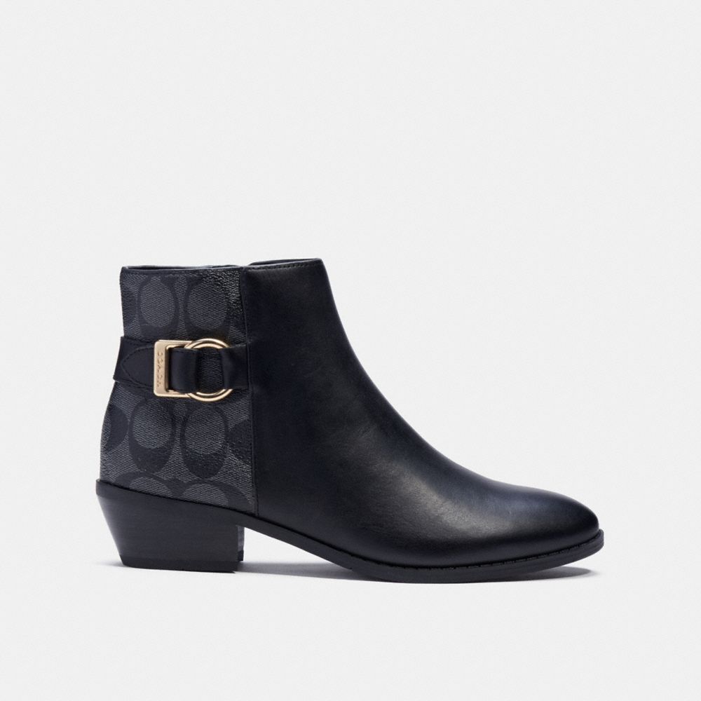 Leather and Signature coated canvas upper| Man-made leather lining and footbed| Rubber outsole| Zip closure| Shaft: 5 1/2" height, 9 3/4" circumference| 1 1/4" heelStyle No. C5772
