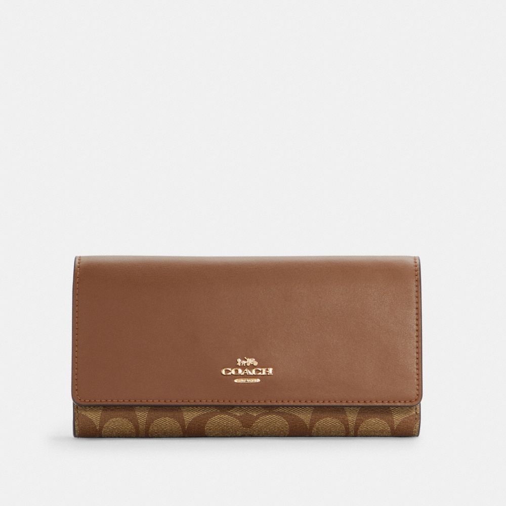 Signature coated canvas and smooth leather| 13 credit card slots| Full-length bill compartments| ID window| Inside zip coin pocket| Snap closure| 6 3/4" (L) x 3 1/2" (H)