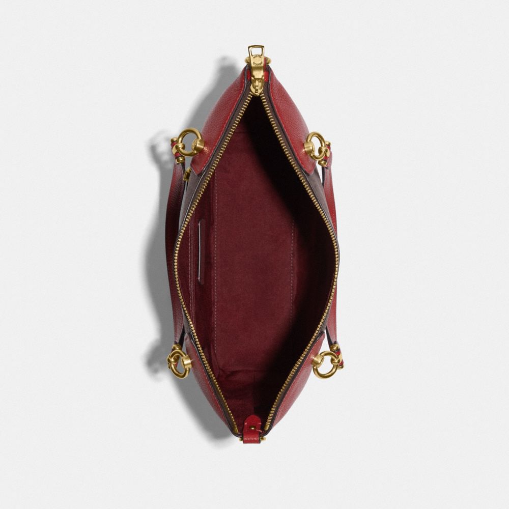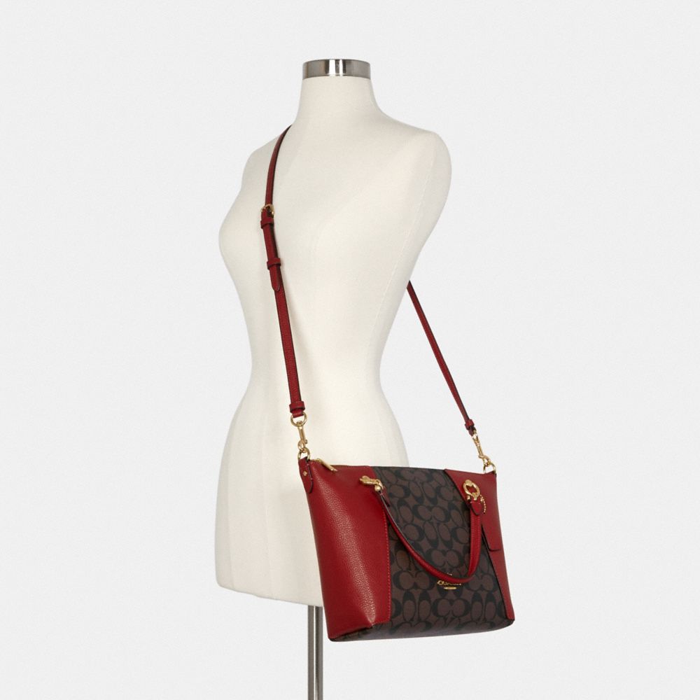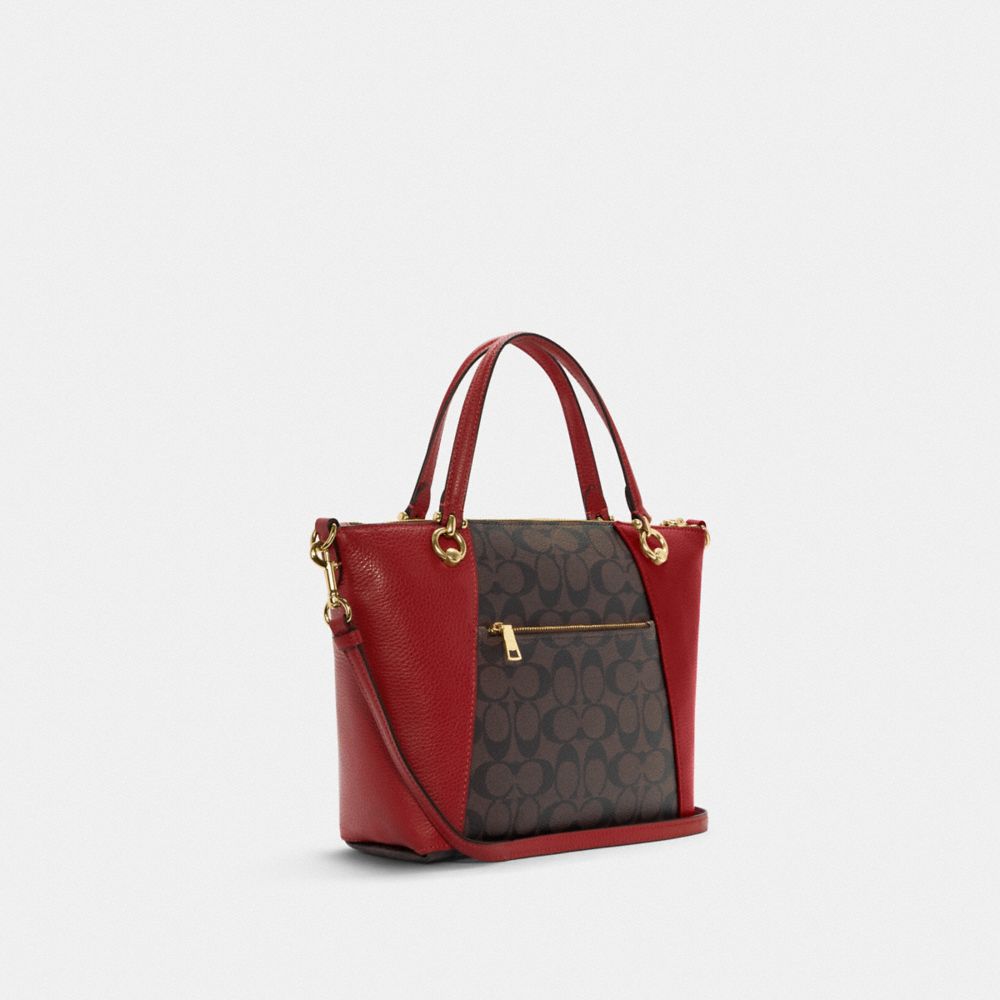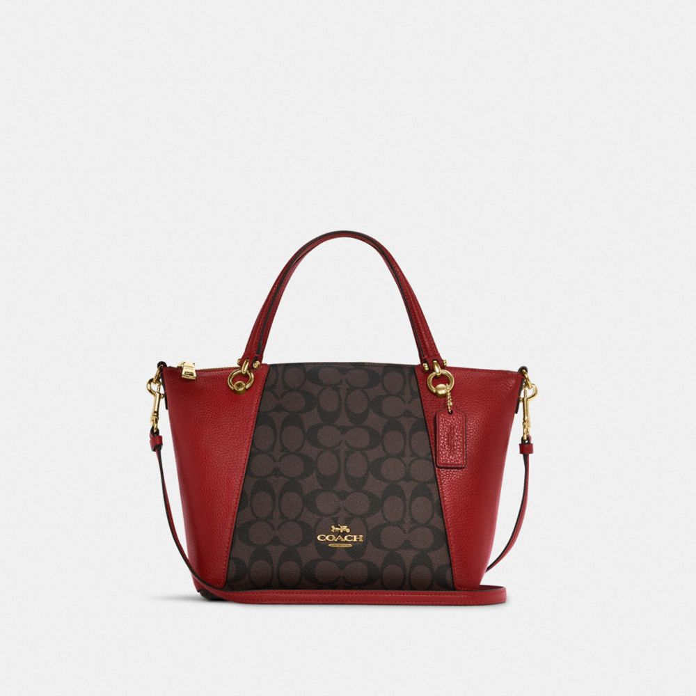 Signature coated canvas and refined leather| Inside zip pocket| Zip-top closure, fabric lining| Handles with 5" drop| Outside zip pocket| Detachable strap with 22" drop for shoulder or crossbody wear| 8 1/4" (L) x 8 1/2" (H) x 3 3/4" (W)Style No. C6230