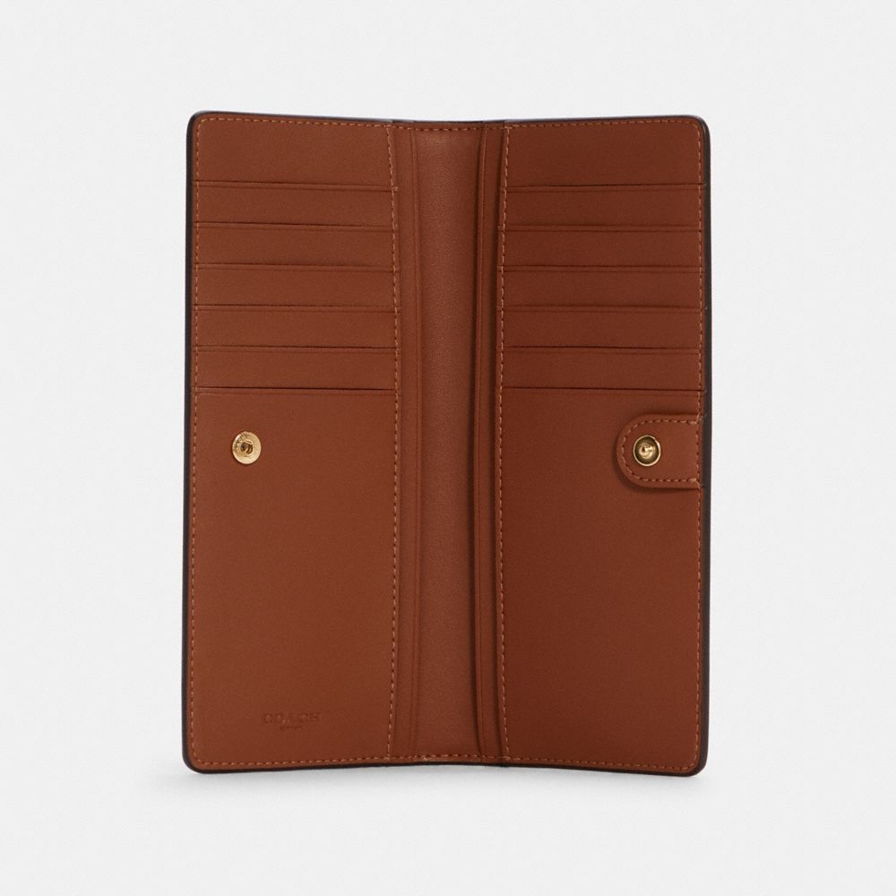 Signature coated canvas and smooth leather| 12 credit card slots| Full-length bill compartments| Snap closure| Outside zip pocket| 7 1/2" (L) x 3 1/2" (H) x 1/2 (W)Style No. C7305