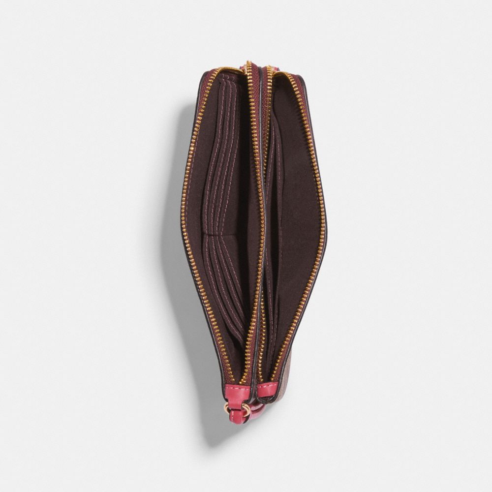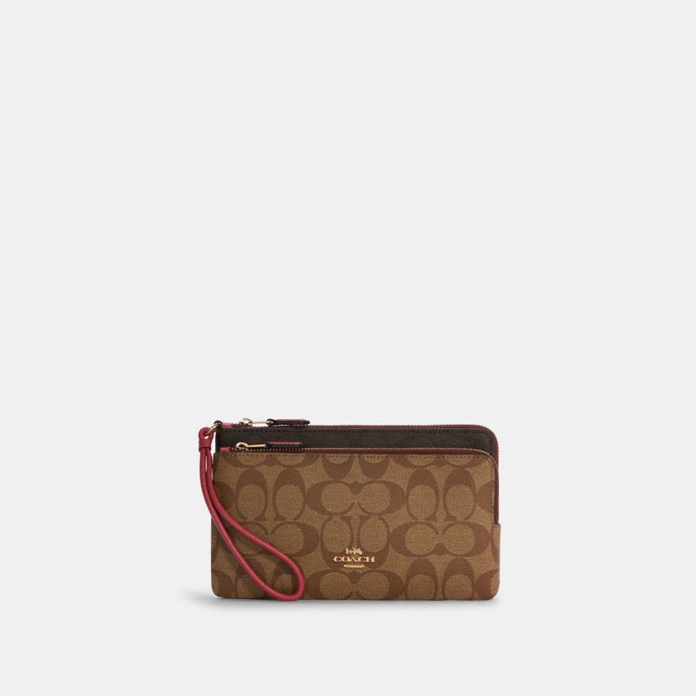 Signature coated canvas and smooth leather| Six credit card slots| Full-length bill compartment| Inside open pockets| Double zip closure, fabric lining| Wrist strap attached| 8" (L) x 4 3/4" (H) x 1 1/4" (W)| Fits all phone sizes up to an iPhone X and Samsung S7 EdgeStyle No. C7313