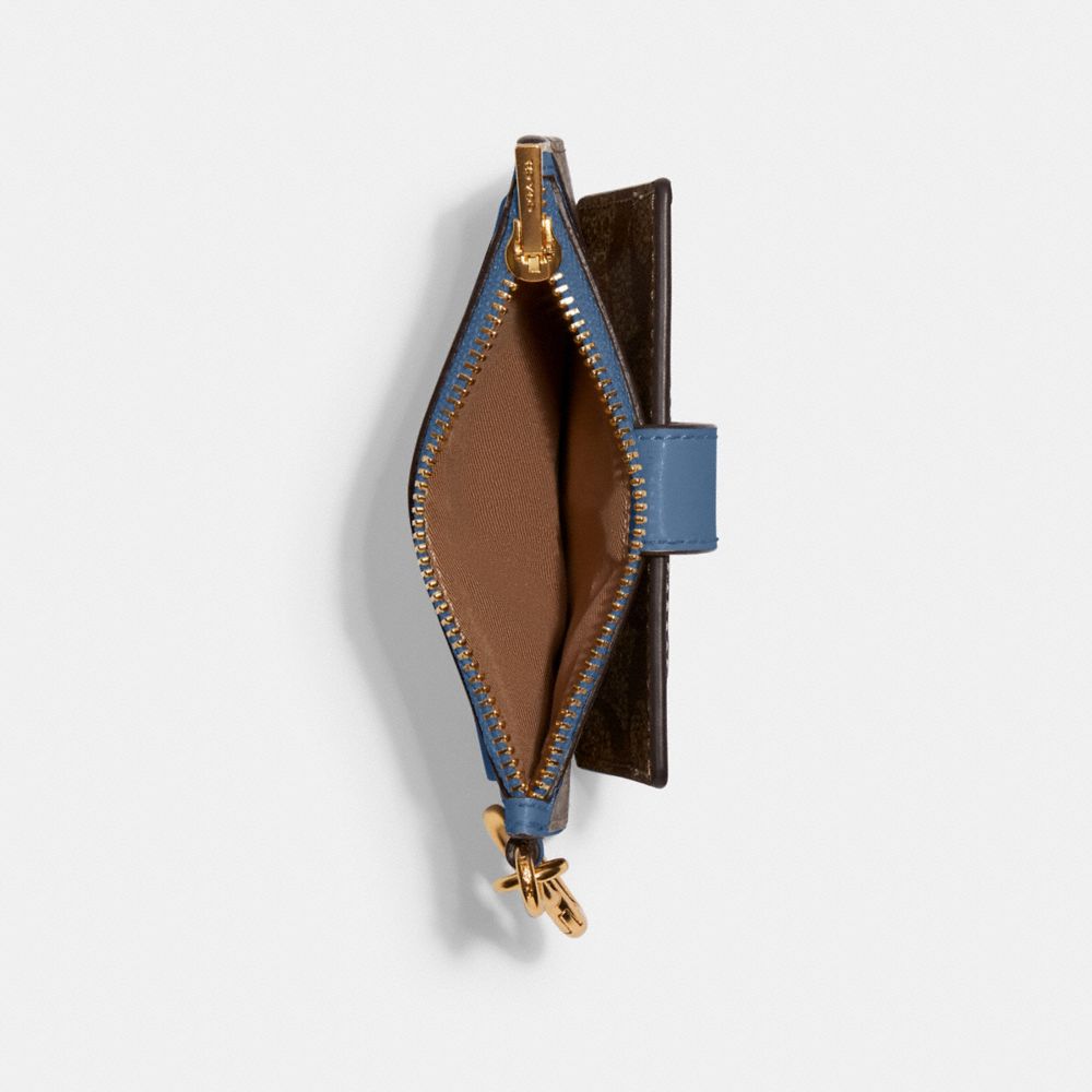Signature coated canvas and smooth leather| Three credit card slots| ID window| Snap closure| Zip compartment| Attached hinged key ring| 4 3/4" (L) x 3" (H)Style No. C7398