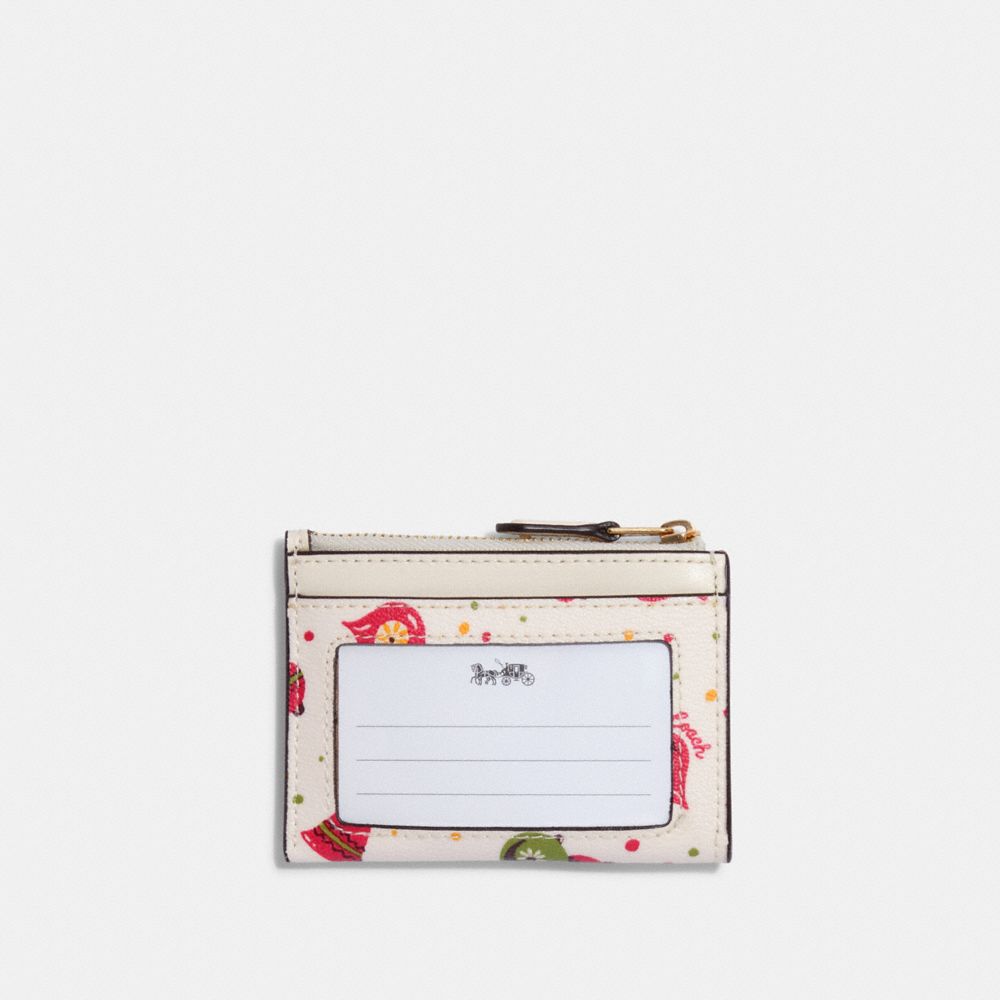 Printed coated canvas and smooth leather| Two credit card slots| ID window| Zip-top closure, fabric lining| Attached split key ring| 4 1/4" (L) x 3" (H) x 1/2" (W)Style No. C7681