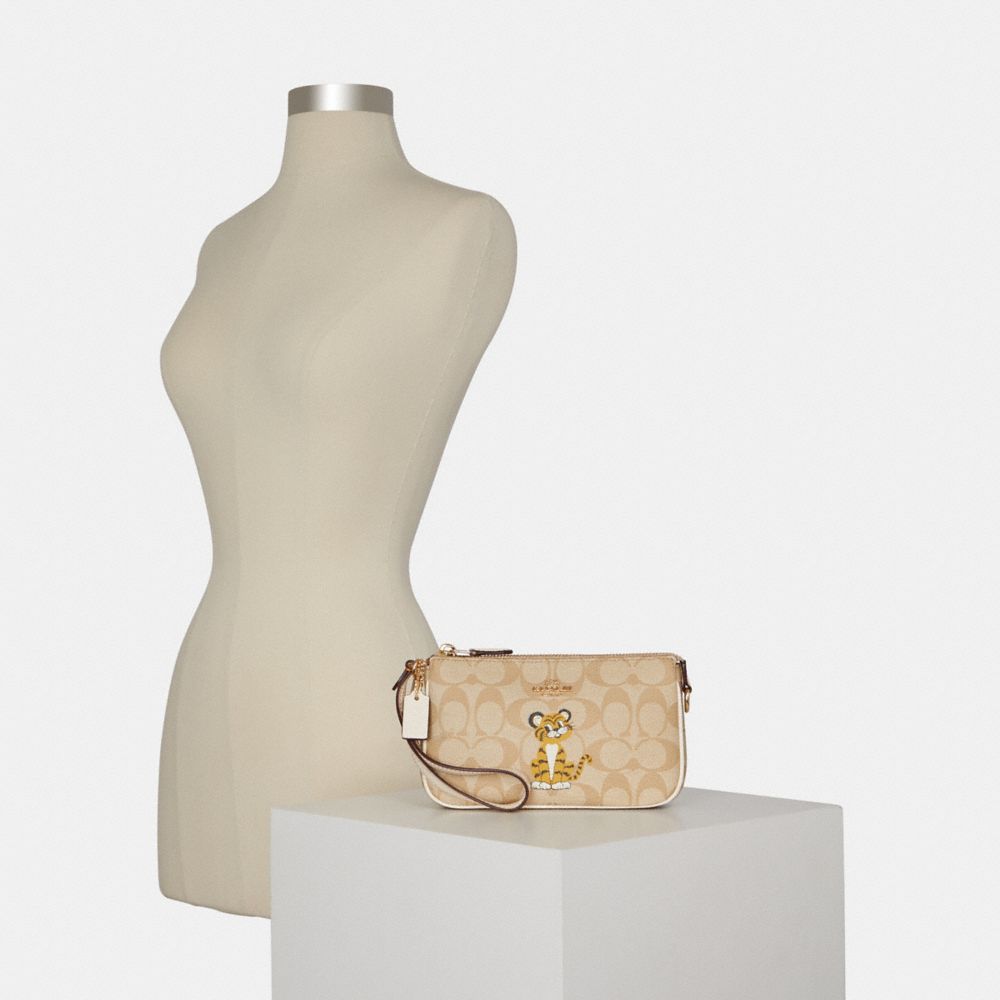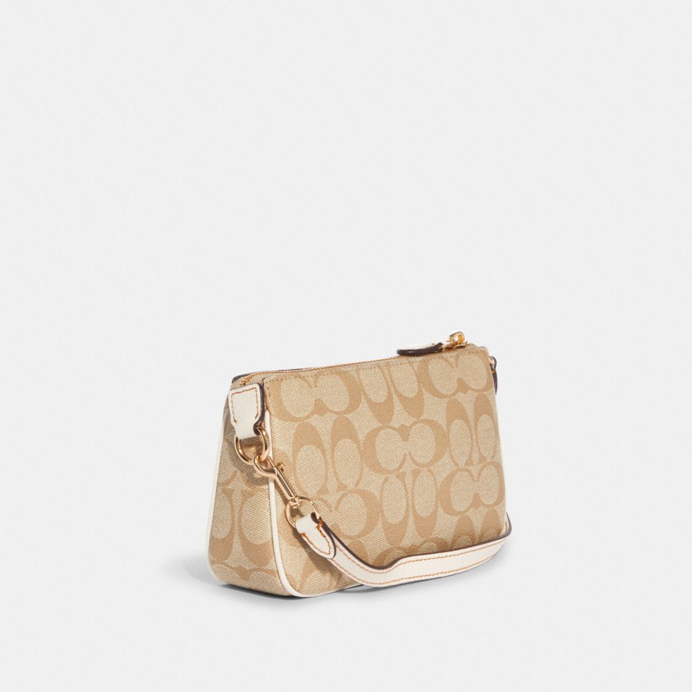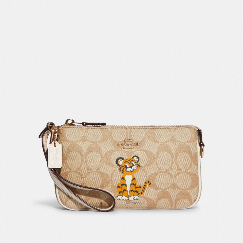 Signature coated canvas and refined pebble leather| Two credit card slots| Inside multifunction pocket| Zip-top closure, fabric lining| Handle with 6 1/4" drop| 7 1/2" (L) x 4 1/2" (H) x 2" (W)Style No. C7699