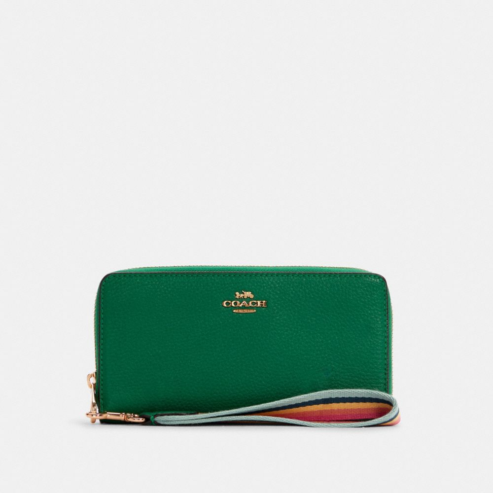 Refined pebble leather| Twelve credit card slots| Full-length bill compartments| Inside zip coin pocket| Zip-around closure| Detachable wrist strap| 7 1/2" (L) x 4" (H) x 1" (W)Style No. C8277