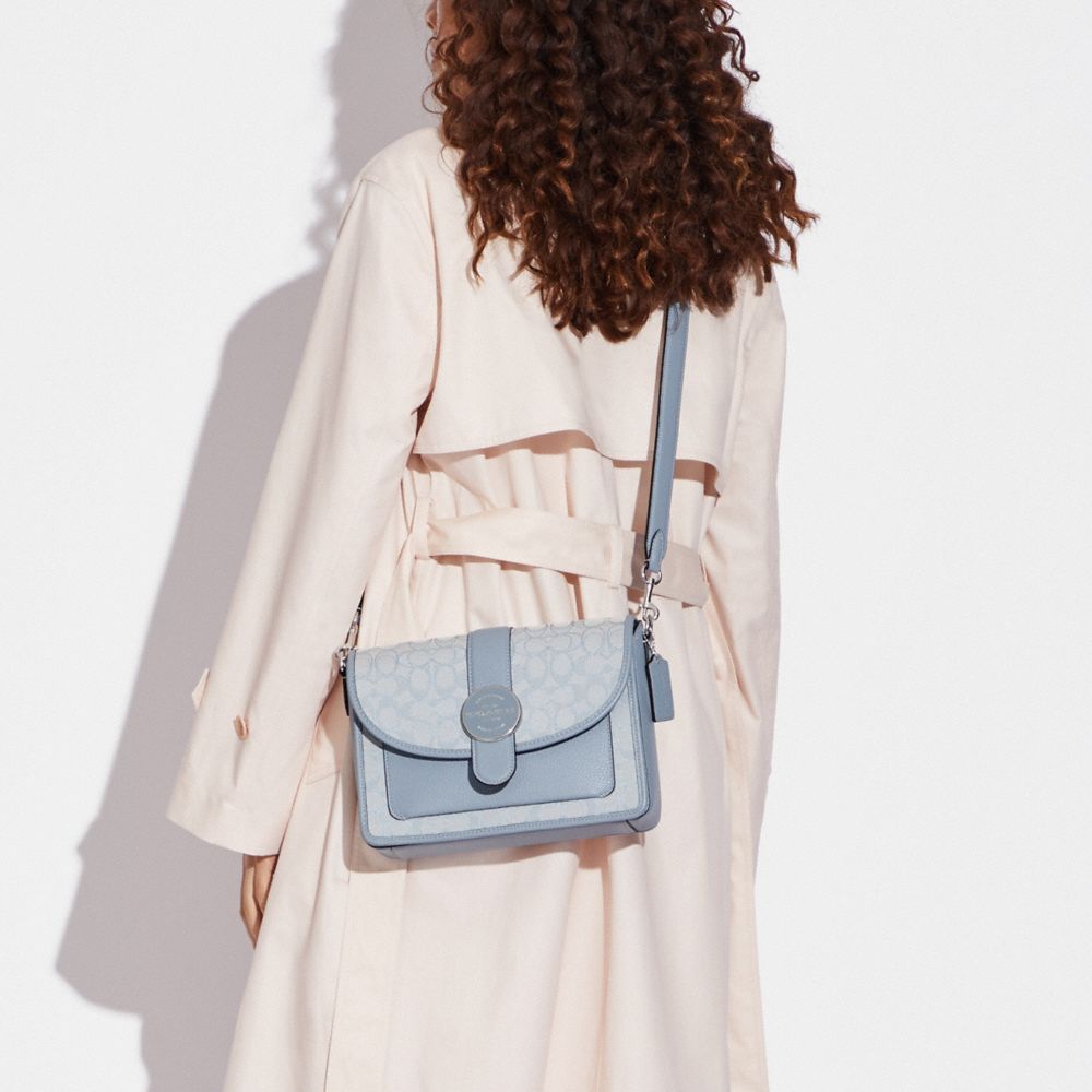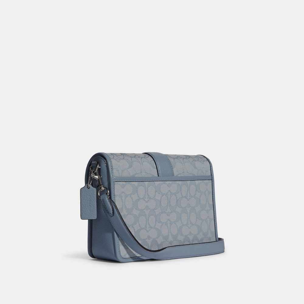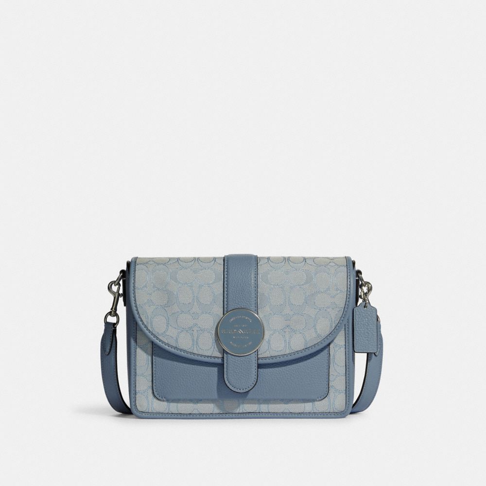 Signature jacquard and refined pebble leather| Inside multifunction pockets| Snap closure, fabric lining| Outside open pocket| Detachable strap with 21 1/2" drop for shoulder or crossbody wear| 10" (L) x 7 1/4" (H) x 2 1/2" (W)Style No. C8307