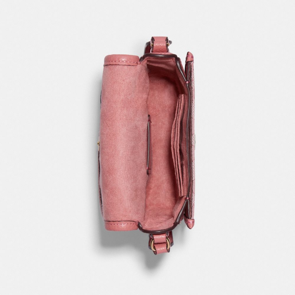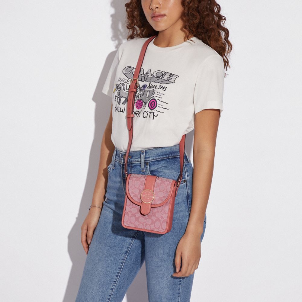 Signature jacquard and refined pebble leather| Two credit card slots| Snap closure, fabric lining| Adjustable strap with 23" drop for shoulder or crossbody wear| 6" (L) x 6 3/4" (H) x 1 3/4" (W)Style No. C8321