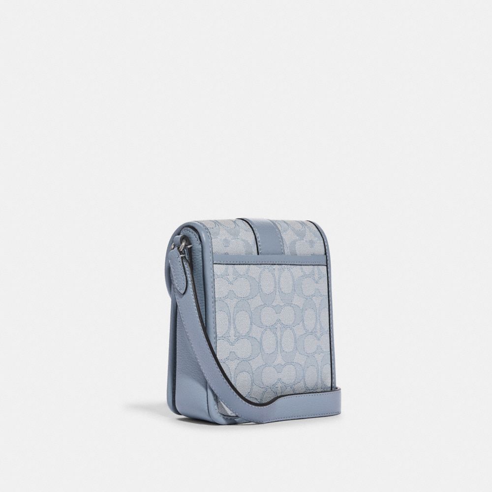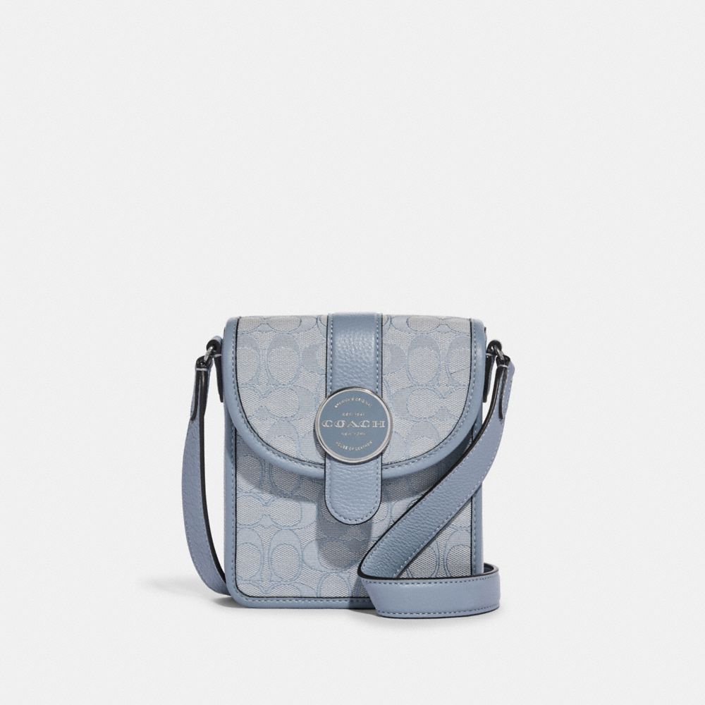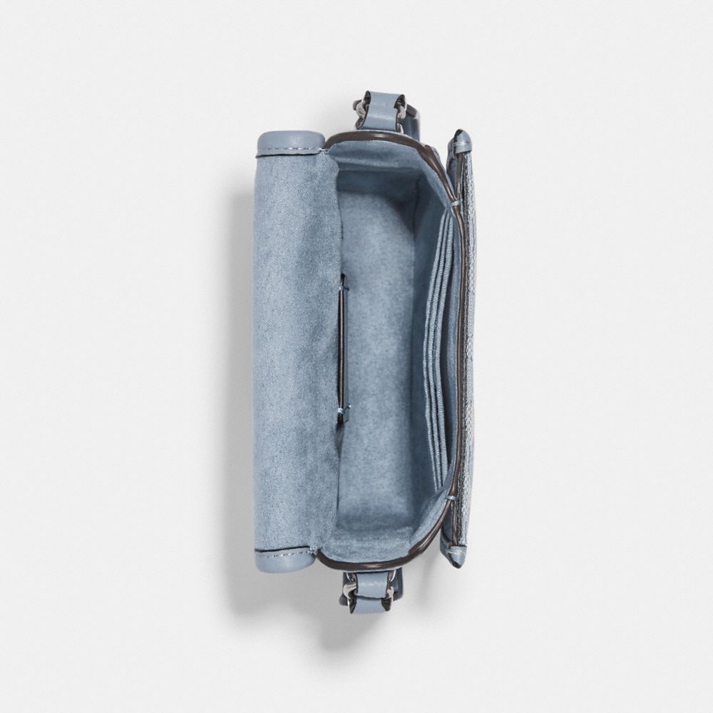 Signature jacquard and refined pebble leather| Two credit card slots| Snap closure, fabric lining| Adjustable strap with 23" drop for shoulder or crossbody wear| 6" (L) x 6 3/4" (H) x 1 3/4" (W)Style No. C8321