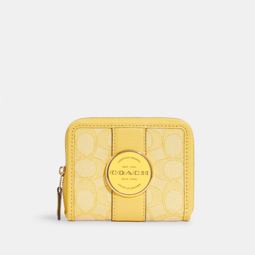 Signature jacquard and refined pebble leather| Two credit card slots| ID window| Full-length bill compartment| Inside open pockets| Zip-around closure| 4 1/2" (L) x 3 3/4" (H) x 3/4" (W)Style No. C8323