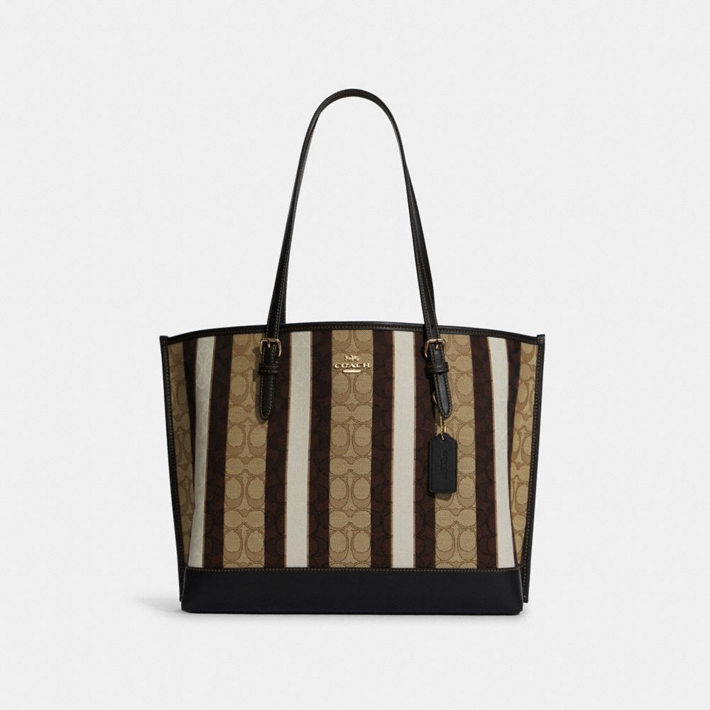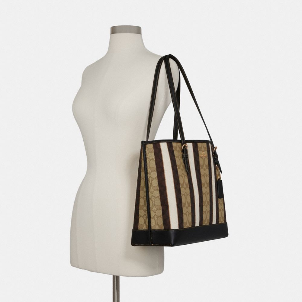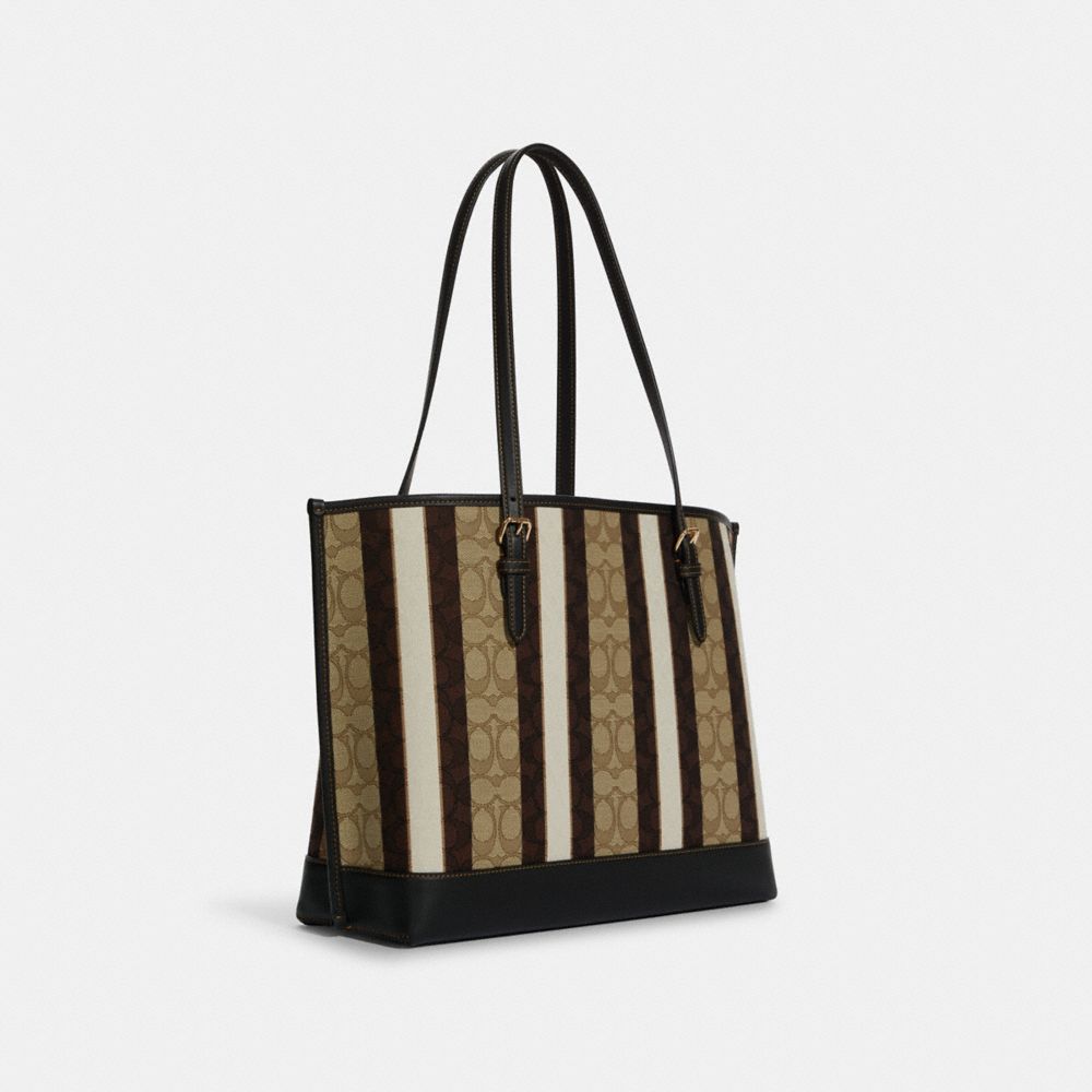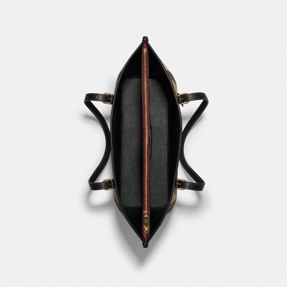 Signature jacquard and smooth leather| Inside multifunction pocket| Zip-top closure, fabric lining| Handles with 10 1/4" drop| Side open compartments| 13 1/4" (L) x 11" (H) x 5" (W)Style No. C8415