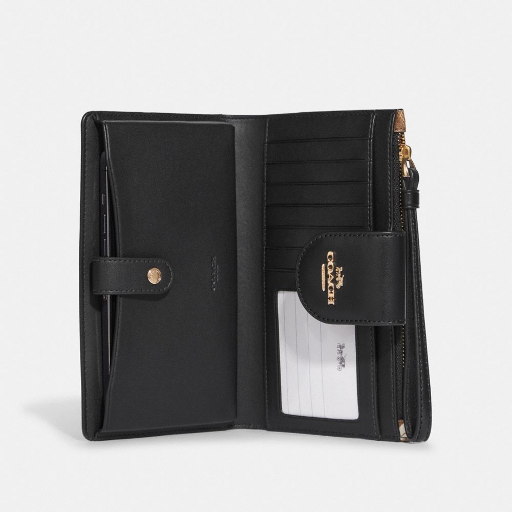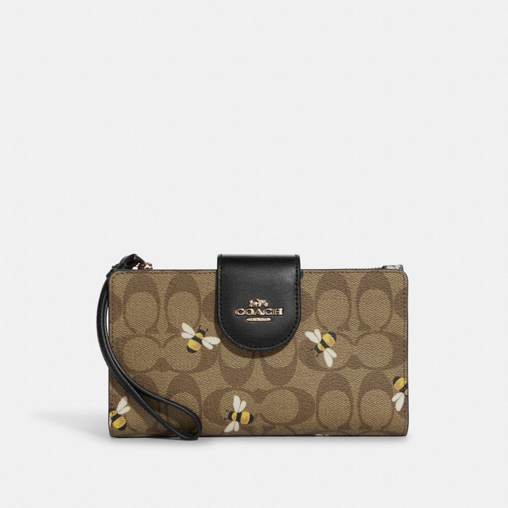Signature coated canvas and smooth leather| Six credit card slots| ID window| Snap phone compartment| Snap closure| Outside zip pocket| Attached wrist strap| 7 1/4" (L) x 4 1/2" (H)| Fits all iPhone and Samsung Galaxy phonesStyle No. C8676